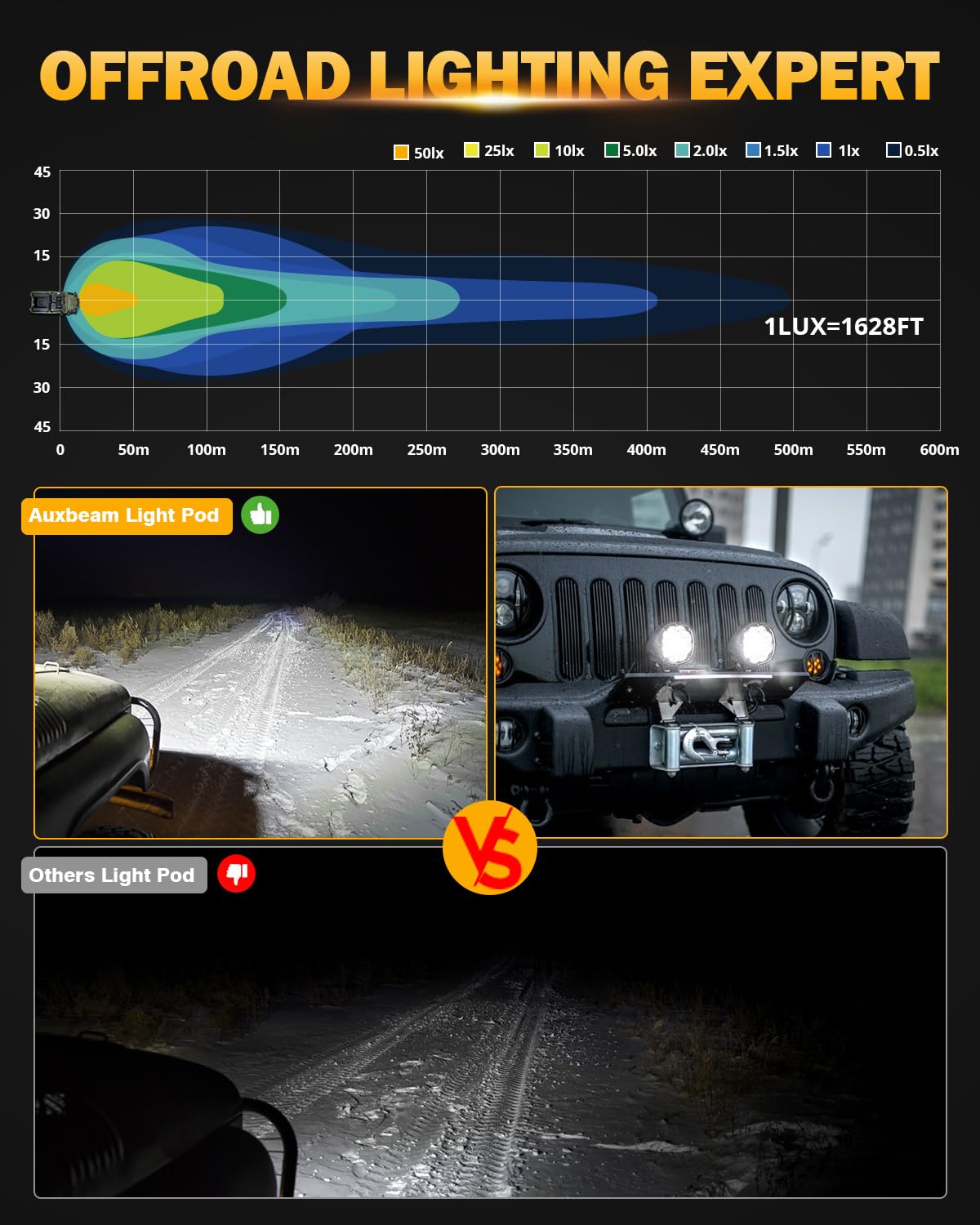 Super Bright: 4 inch round driving lights use advance led chips with high lumen, high brightness! Each led off-road round light quipped with a 9pcs*5w 3535 led chip, emits 9000lm super bright light and provides a 6200K spot white beam, much brighter than stock light pod or another light pod | Upgraded EMC Design: Auxbeam round light pods with faster on/off response time. Without electromagnetic interference, completely isolate the electromagnetic wave from the interference of car audio and driving computer, escort for safe driving | Premium Quality: Built-in IP68 waterproof, adopts upgraded waterproof die-casting aluminum housing and advanced sealing technology to withstand any harsh environments and weather conditions | Easy Installation: Come with mount instructions, just plug & play. This light bar can be mounted on the roof rack, bull bar, headache rack, and running bar. Super cool engineering beam pattern design, nice performance even on foggy days | Buy with Confidence: Our led pod lights are used for almost all Off-Road Vehicles, Motorcycles, ATVs, UTVs, SUVs, Construction Vehicles, Farm Vehicles, Trucks, Buses, Pick-ups, Marine, Boat, etc. Operating voltage of 9-32V. If you have any problems, please feel free to contact us, and we will provide you with 2 years of after-sales service!
