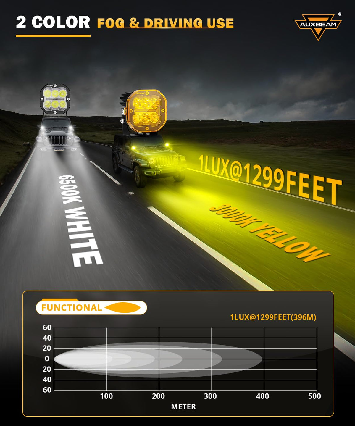 Tech Specs LED Power: 84W Working Voltage: 9-32V LED Lumen: 9600LM Luminous Flux: 1Lux@1299ft LED Type: 3535 SMD, 3030 SMD Beam Pattern: Spot Flood Combo/DRL/Turn Signal Color Temperature: 3000K Amber/6500K White Materials: PC, Aluminum Ingress Protection: IP68 Waterproof Lifespan: 50,000+ Hours Package Included 2 x LED Offroad Light 2 x Yellow Cover 2 x Black Cover 2 x Conversion Harness 1 x DT Wiring Harness 1 x Installation Hardware Kit
