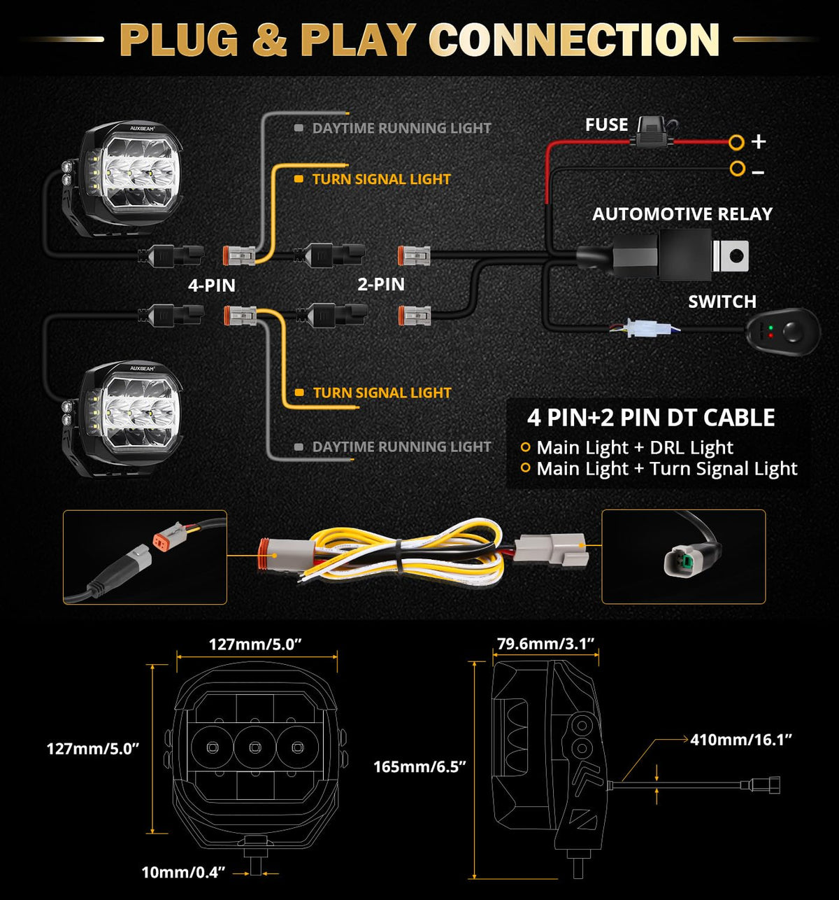 Tech Specs LED Power: 174W Working Voltage: 9-32V LED Lumen: 20400LM Luminous Flux: 1Lux@2519ft LED Type: P8 Chips + 3030 SMD Beam Pattern: White Spot/Yellow Combo Color Temperature: 3000K Yellow/6500K White Materials: PC, Aluminum Ingress Protection: IP68 Waterproof Lifespan: 50,000+ Hours Package Included 2 x LED Offroad Light 2 x Yellow Cover 2 x Black Cover 2 x Conversion Harness 1 x DT Wiring Harness 1 x Installation Hardware Kit 1 x User Manual 1 x Auxbeam Sticker