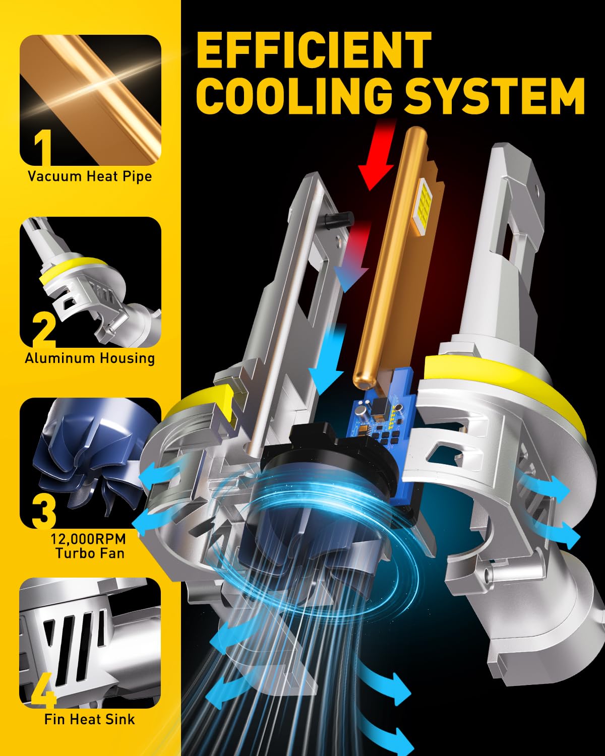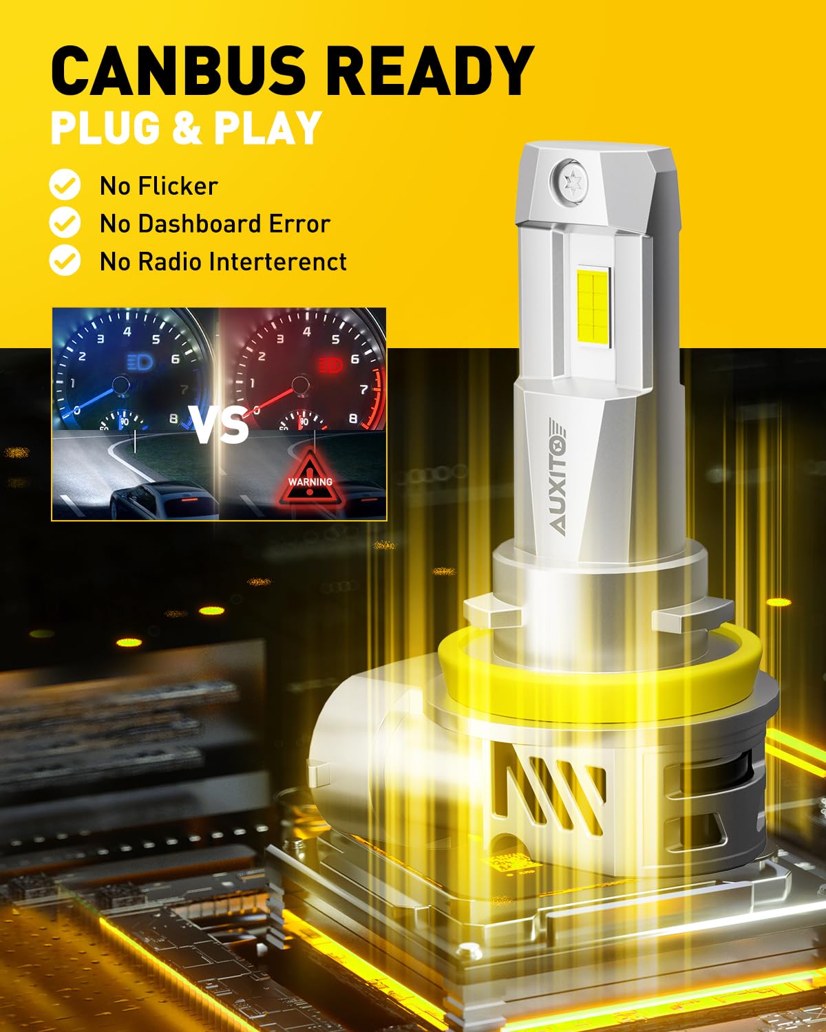 The AUXITO bulbs powered by 32 state-of-the-art CSP chips, offer a remarkable 30,000 lumens of illumination per set, with a crisp 6500K color temperature. This equates to an 800% brightness increase over conventional halogen bulbs, flooding your path with a daylight-like clarity. | Designed to the precise 1:1 dimensions of traditional halogen bulbs, AUXITO bulbs feature an all-in-one compact form that eliminates the need for a bulky base. Enjoy a perfect fit with zero installation hassles, as they snugly fit into the light housing. No specialized skills required-just plug and play for an upgrade that's completed in minutes | The AUXITO light bulbs are crafted for longevity with an impressive lifespan of over 50,000 hours, ensuring consistent, high-efficiency lighting without the worry of light decay. These bulbs outlast halogen bulbs by a staggering 100 times, virtually eliminating the need for frequent replacements. | The AUXITO light bulb is meticulously engineered to replicate the safe beam pattern of original car bulbs, featuring a precise cut-off line that prevents dazzling oncoming traffic. With a 0.03-inch ultra-thin copper plate, it delivers a 360-degree illumination, eliminating dark spots for a wider and farther field of vision. This advanced design gives you the crucial extra time to react to potential hazards, enhancing your night driving experience with confidence and clarity | The AUXITO bulbs, equipped with an upgraded driver and backed by thorough professional testing, ensure seamless compatibility with 99% of vehicles, delivering a trouble-free installation experience. For the rare instances where a vehicle's sensitive computer system may trigger an error message or flicker, a supplementary decoder is available to resolve the issue. Should you require one, simply reach out to our Amazon customer service, and we will promptly dispatch the necessary decoder to ensure your complete satisfaction with the product