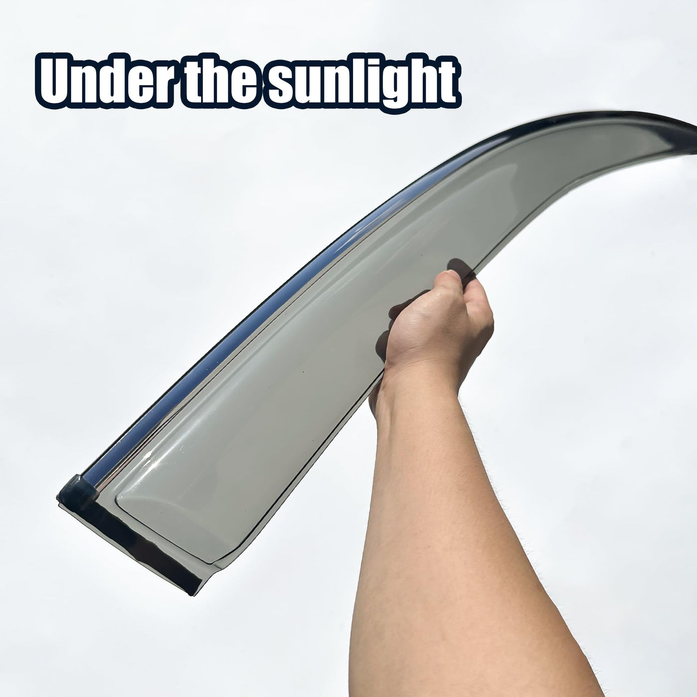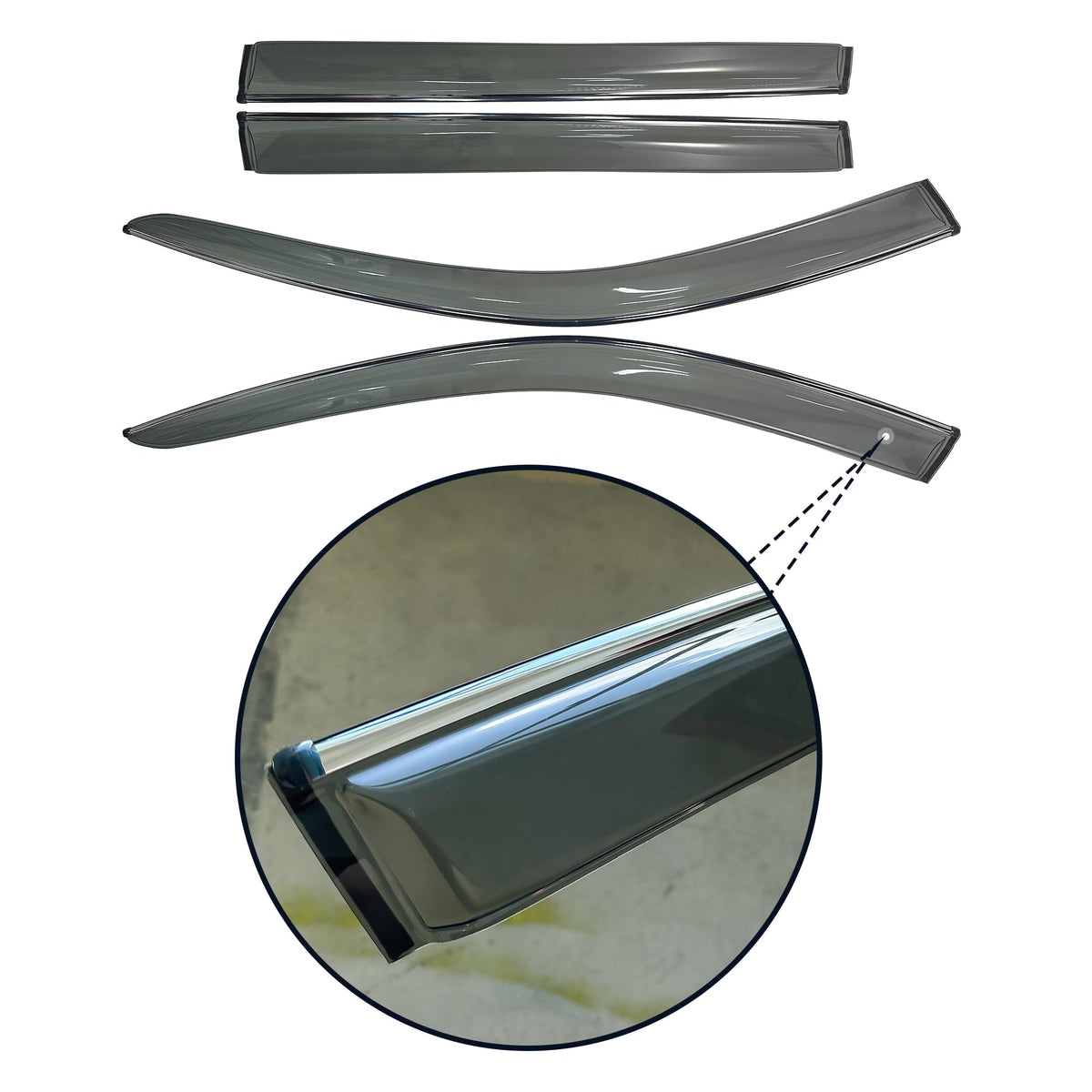 ?Window Rain Guard Vent Deflectors allow you to drive or park in the rain & snow with the window slightly open without the interior getting wet.?Rain Guard Visors offer decreased wind noise & keep you cool in hot summer heat.?Window Vent Deflectors are over-window mount tape installation, won't scratch window glass or tints.?Rain Guard Visors offer easy Install, Just clean application area, peel & stick. (be sure to test fit first)?Window Vent Deflector are crafted from high-strength Acrylic for durable long product life.?Dark tint-smoke allows maximum sun protection, and saves fuel, less air conditioning needed.