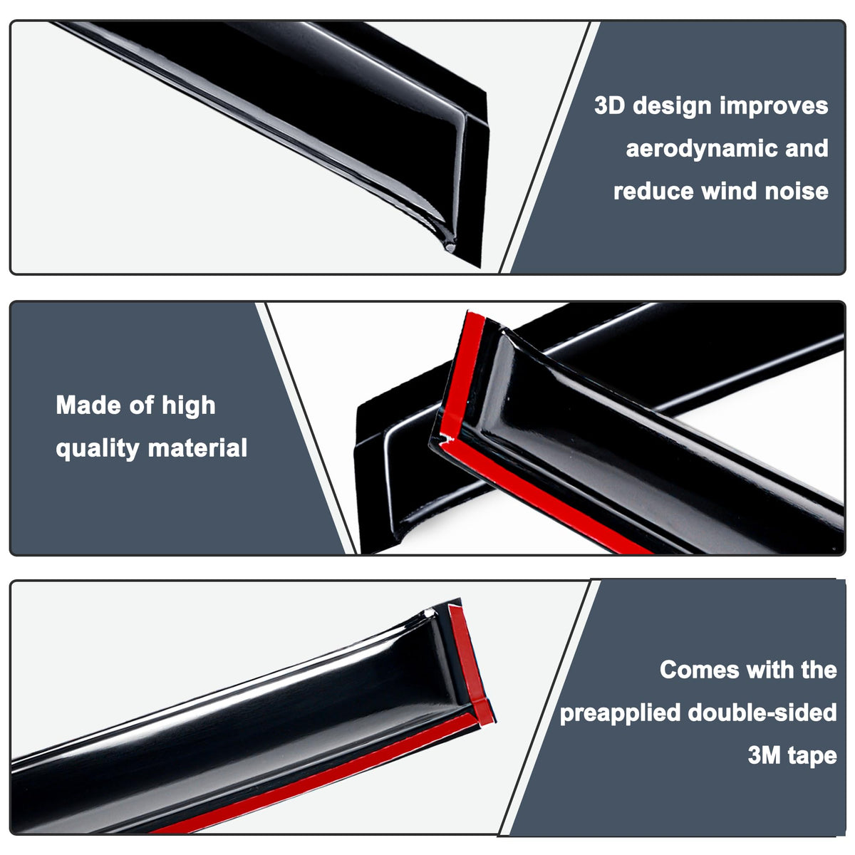?Window Rain Guard Vent Deflectors allow you to drive or park in the rain & snow with the window slightly open without the interior getting wet.?Rain Guard Visors offer decreased wind noise & keep you cool in hot summer heat.?Window Vent Deflectors are over-window mount tape installation, won't scratch window glass or tints.?Rain Guard Visors offer easy Install, Just clean application area, peel & stick. (be sure to test fit first)?Window Vent Deflector are crafted from high-strength Acrylic for durable long product life.?Dark tint-smoke allows maximum sun protection, and saves fuel, less air conditioning needed.