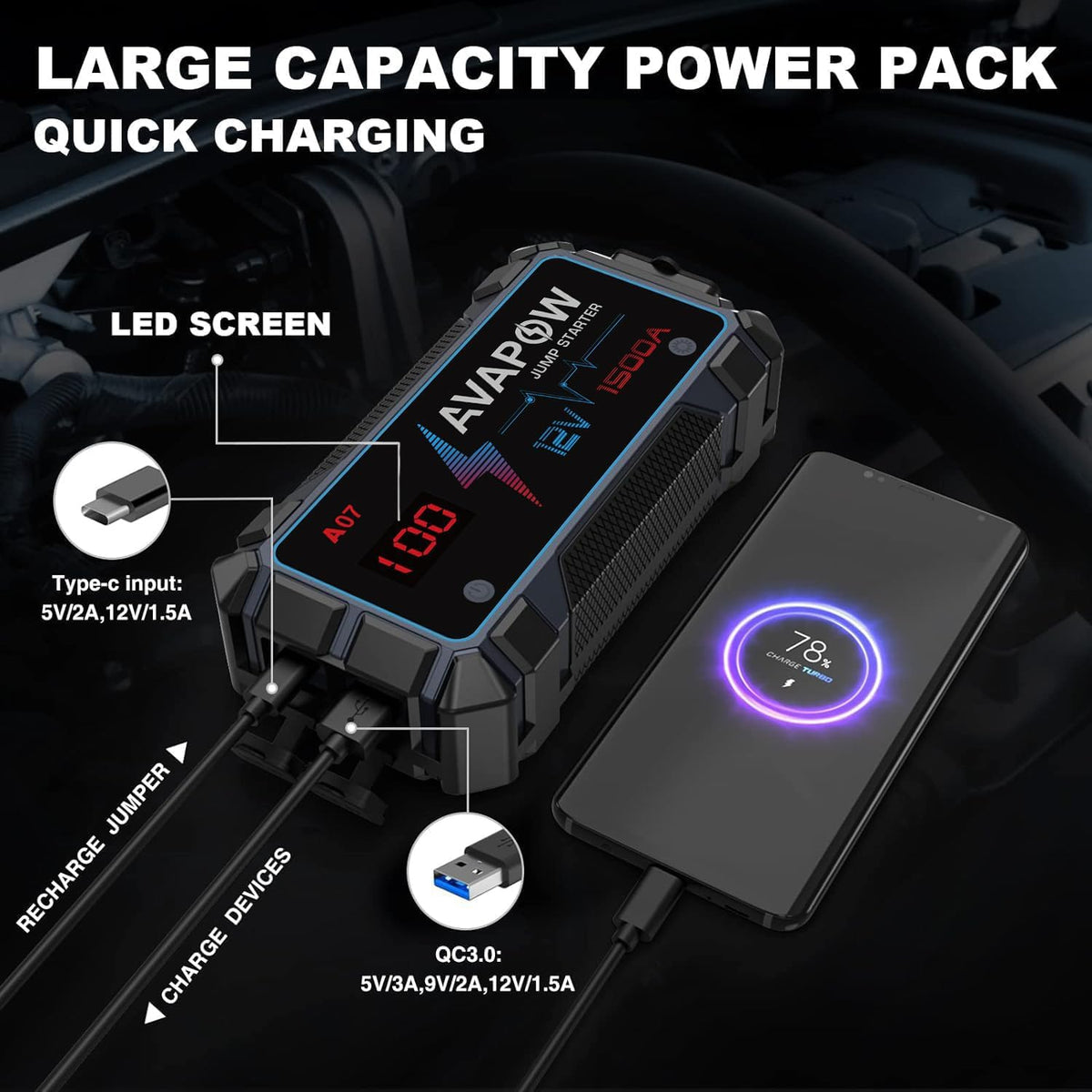 Q: Can I charge my devices using the AVAPOW Jump Starter?A: Yes, the AVAPOW Jump Starter features USB quick charging capabilities, allowing you to charge smartphones, tablets, and other USB-powered devices while on the go.