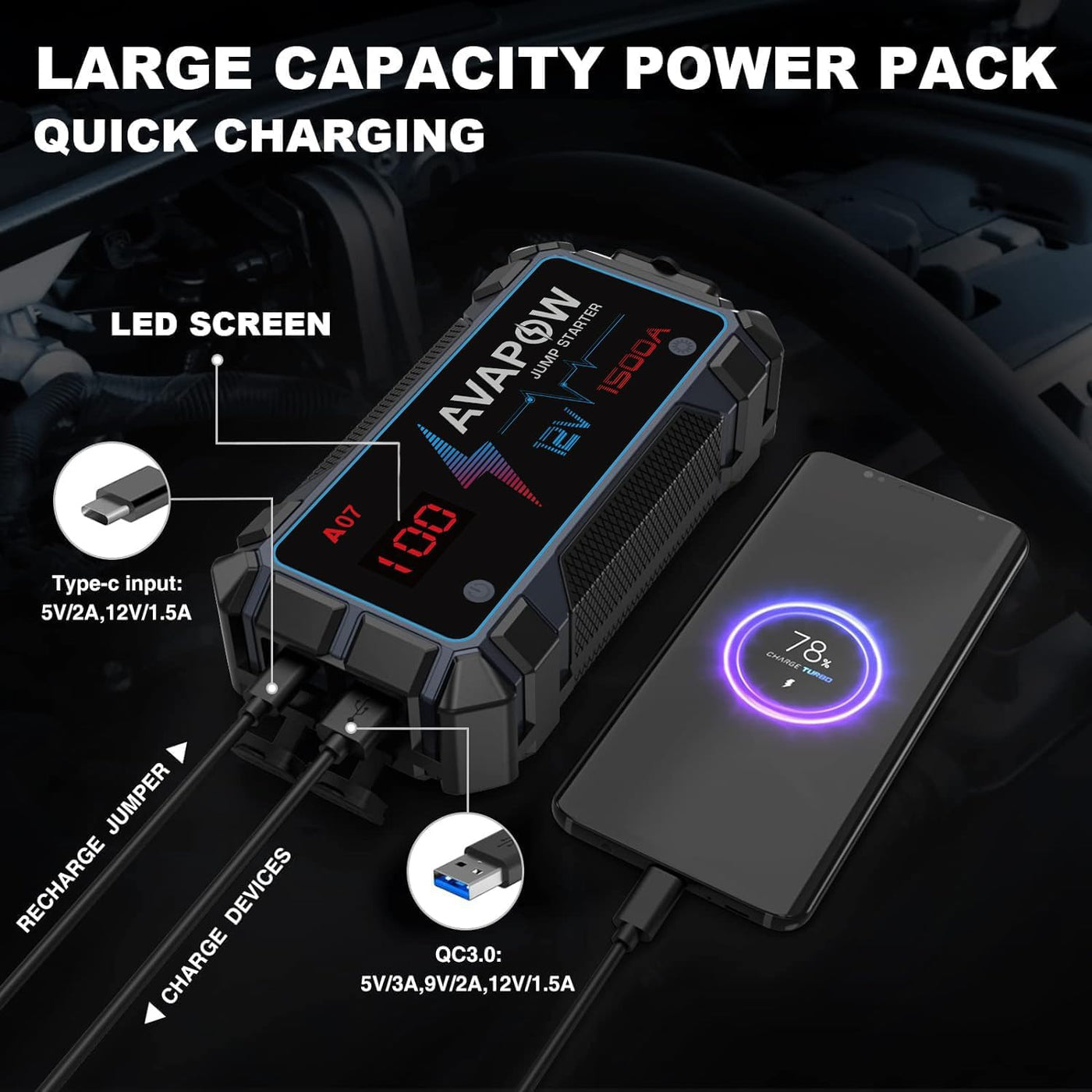 Avapow Jump Starter 1500A Peak Current Jumper Cables Kit For Car(Upto 12V 7L Gas/5.5L Diesel Engine) With Usb Quick Charging And