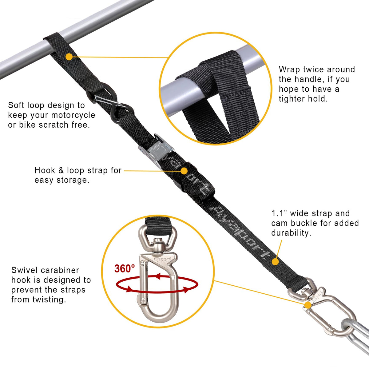 Q: How do the swivel carabiner hooks improve usability?A: The upgraded swivel carabiner hooks on each strap prevent tangling during use, allowing for quick and easy attachment to your motorcycle or other cargo. This design helps keep the straps flat and simplifies the securing process.