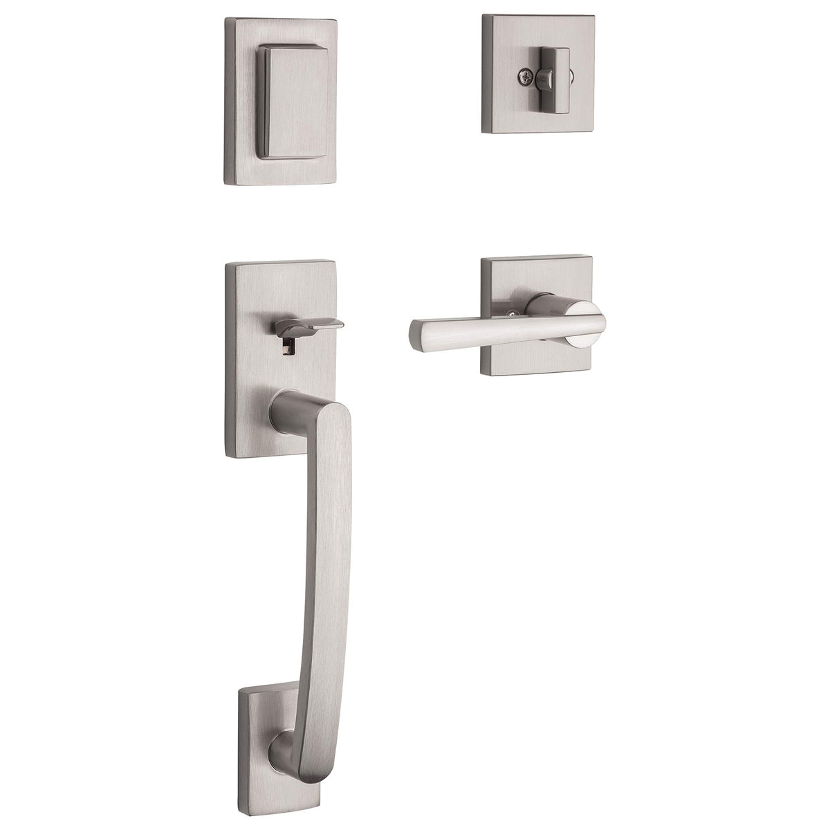 Baldwin Prestige offers a sectional handleset for your SmartKey front door in a satin nickel finish with a low profile door handle design. This modern front door lock is a single cylinder entry set shown in a satin nickel finish. This entry door handleset includes 2 keys; Lifetime mechanical and finish warranty. Featuring SmartKey Security; re-key the lock yourself in seconds in 3 easy steps with a SmartKey door handle. This exterior door lock fits standard door preparations: 1-3/8' to 1-3/4' thick. Introducing Spyglass, Baldwin’s newest addition to its Prestige family of products, which offers effortless style and luxury and is available in retail stores across the nation. Spyglass is a transitional collection inspired by elegant, traditional designs and influenced by contemporary elements such as sleek lines and geometric shapes. Linear details and a gorgeous raised, beveled edge, create dimension and give Spyglass a statement-making look intended to make an impact at first touch. Baldwin door locks and door handles offer elegance and style for every home. This deadbolt handleset combo comes in a beautiful satin nickel. With a smartkey deadbolt easily rekey your lock in three steps. This silver handleset is similar to a brushed nickel handleset, with a modern and contemporary design. With clean lines this square lock is a single cylinder deadbolt that is keyed on one side.