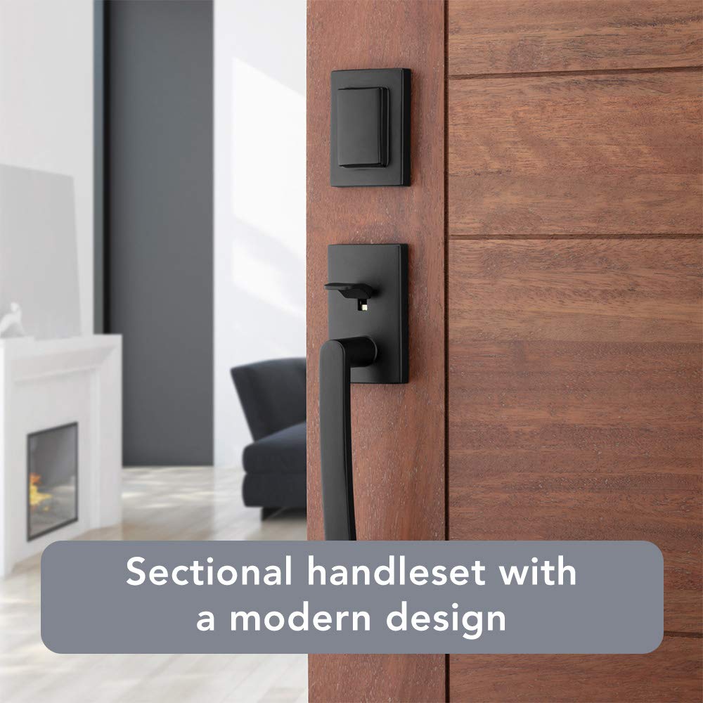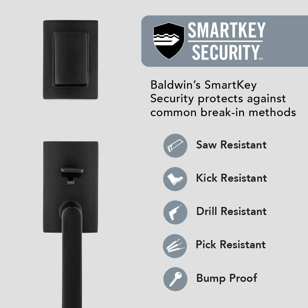 Baldwin Prestige offers a sectional handleset for your SmartKey front door in a Matte Black finish with a low profile door handle design. This modern front door lock is a single cylinder entry set shown in a Matte Black finish. This entry door handleset includes 2 keys; Lifetime mechanical and finish . Featuring SmartKey Security; re-key the lock yourself in seconds in 3 easy steps with a SmartKey door handle. This exterior door lock fits standard door preparations: 1-3/8' to 1-3/4' thick. Introducing Spyglass, Baldwin’s newest addition to its Prestige family of products, which offers effortless style and luxury and is available in retail stores across the nation. Spyglass is a transitional collection inspired by elegant, traditional designs and influenced by contemporary elements such as sleek lines and geometric shapes. Linear details and a gorgeous raised, beveled edge, create dimension and give Spyglass a statement-making look intended to make an impact at first touch. Baldwin door locks and door handles offer elegance and style for every home. This deadbolt handleset combo comes in a beautiful Matte Black. With a smartkey deadbolt easily rekey your lock in three steps. This silver handleset is similar to a brushed nickel handleset, with a modern and contemporary design. With clean lines this square lock is a single cylinder deadbolt that is keyed on one side.