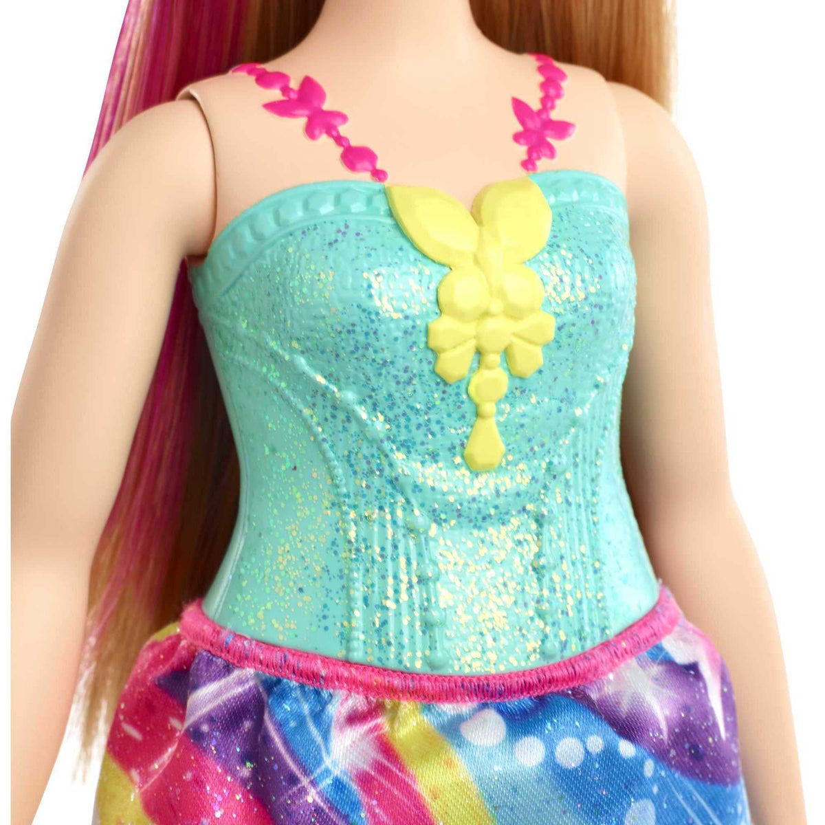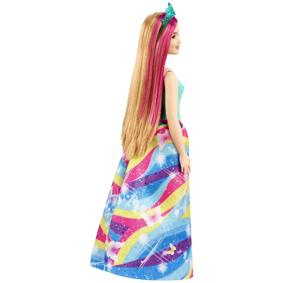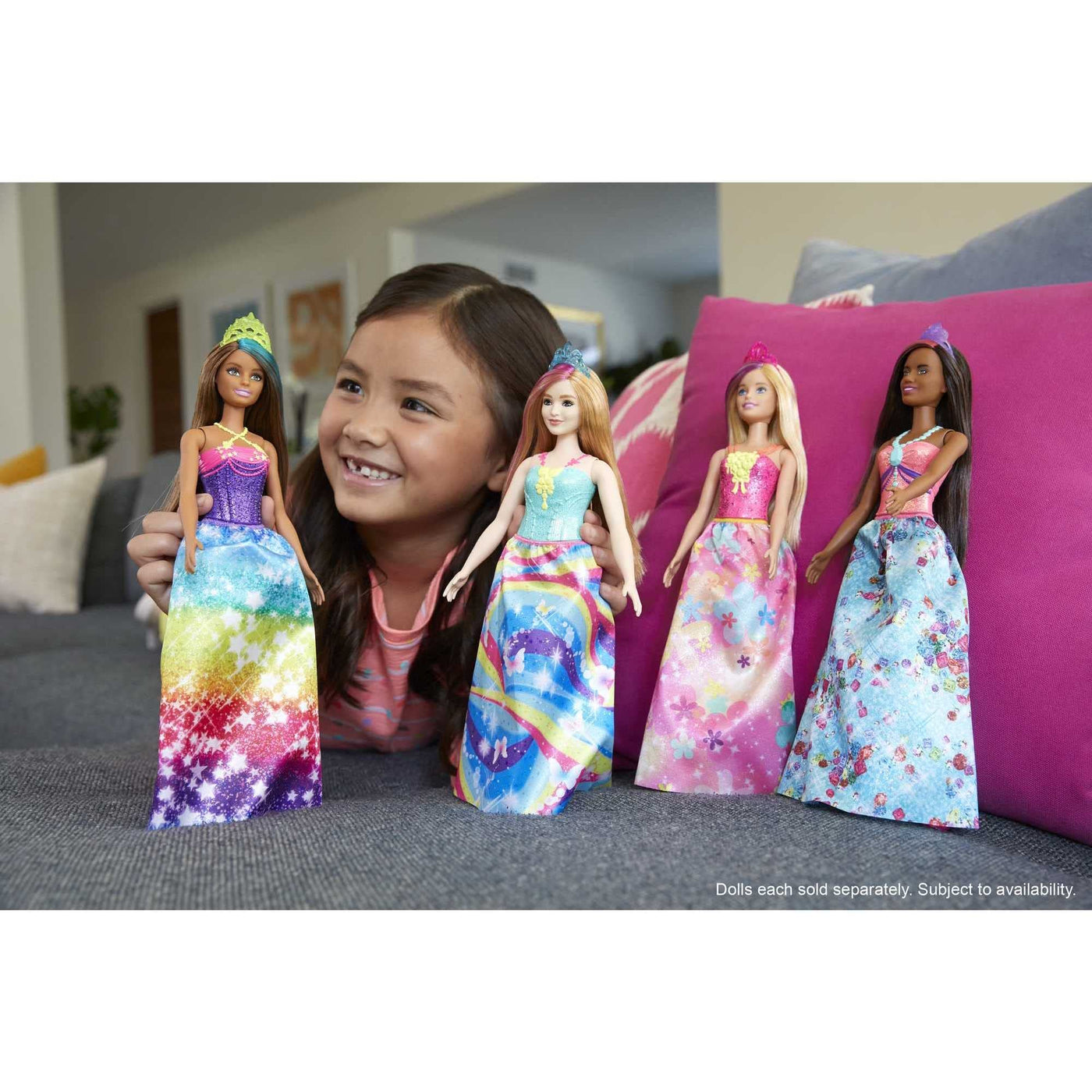 Princess dolls from Barbie Dreamtopia bring fairytale dreams to life in fantastical looks with colorful touches! This Barbie princess doll is dressed for a royal occasion in a sparkly blue bodice and vibrant skirt with a rainbow print. A pink streak in her blonde hair adds a splash of color, and a bright tiara completes her fantastical look. It's easy to play out dreams real and imagined with Barbie princess doll because when you enter Dreamtopia, you wake up to a world where dreams become reality! Fairytale lovers can collect all the Barbie Dreamtopia dolls and toys to build out the world and let their dreams set sail. Each sold separately, subject to availability. Dolls cannot stand alone. Colors and decorations may vary.