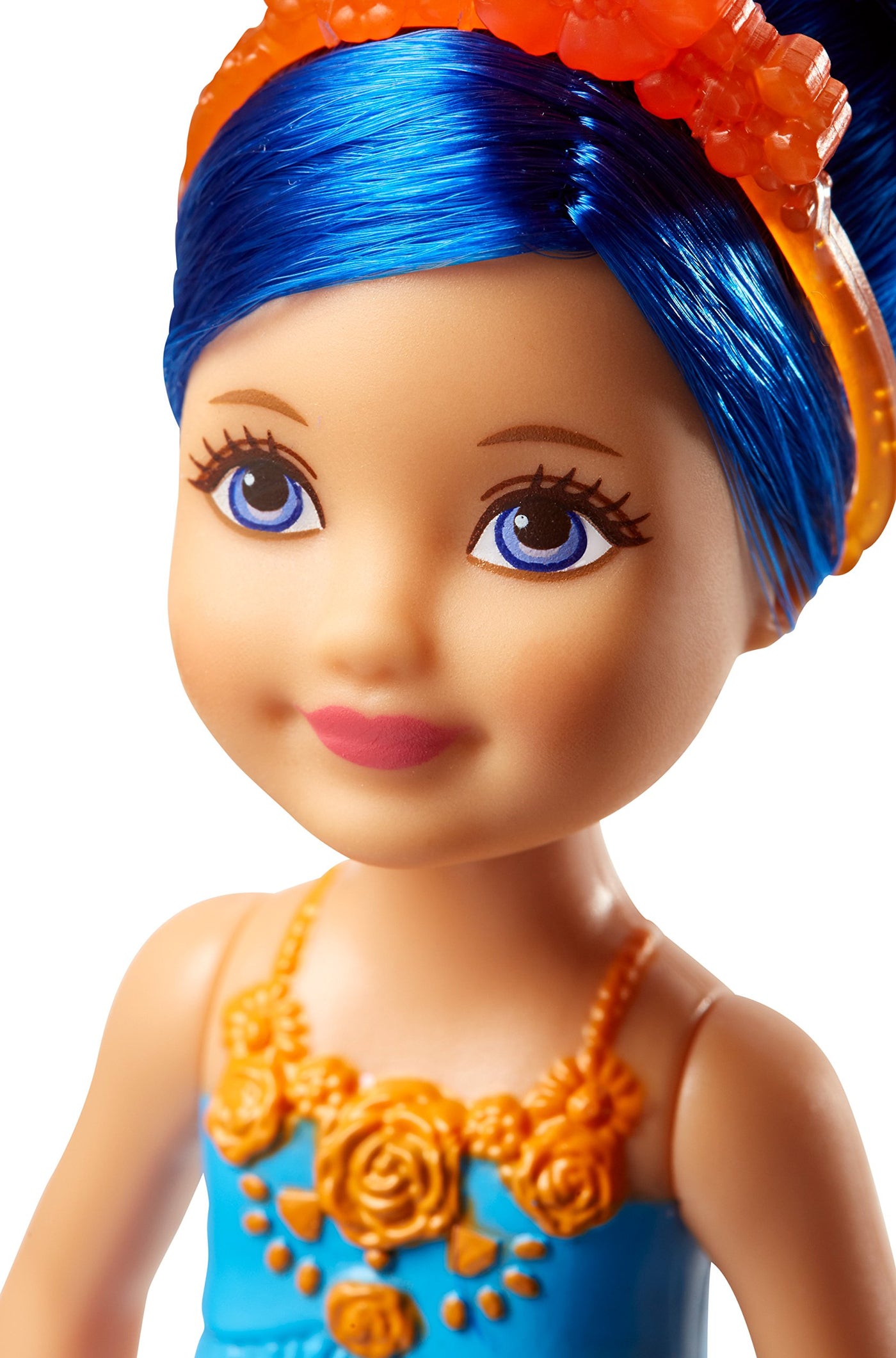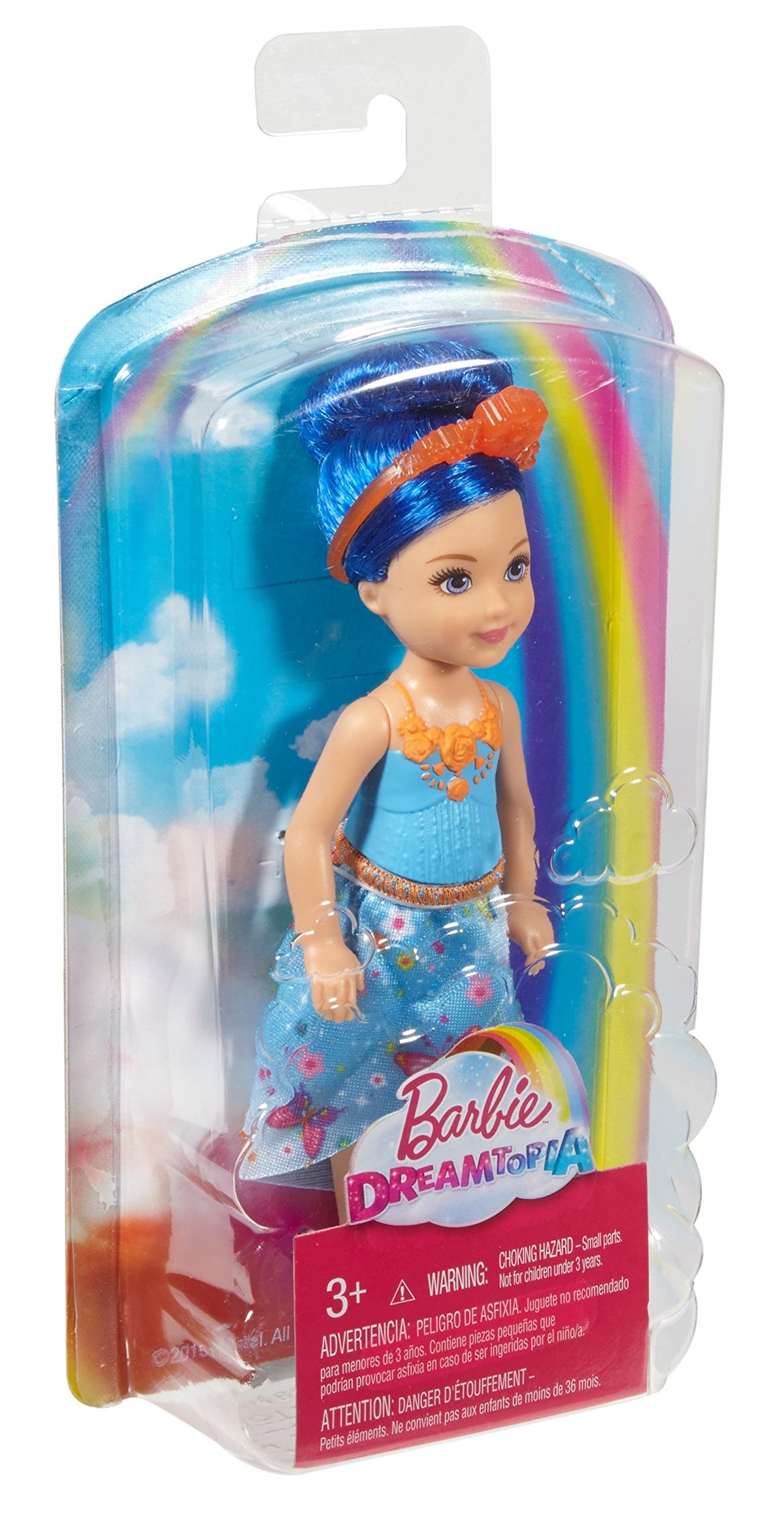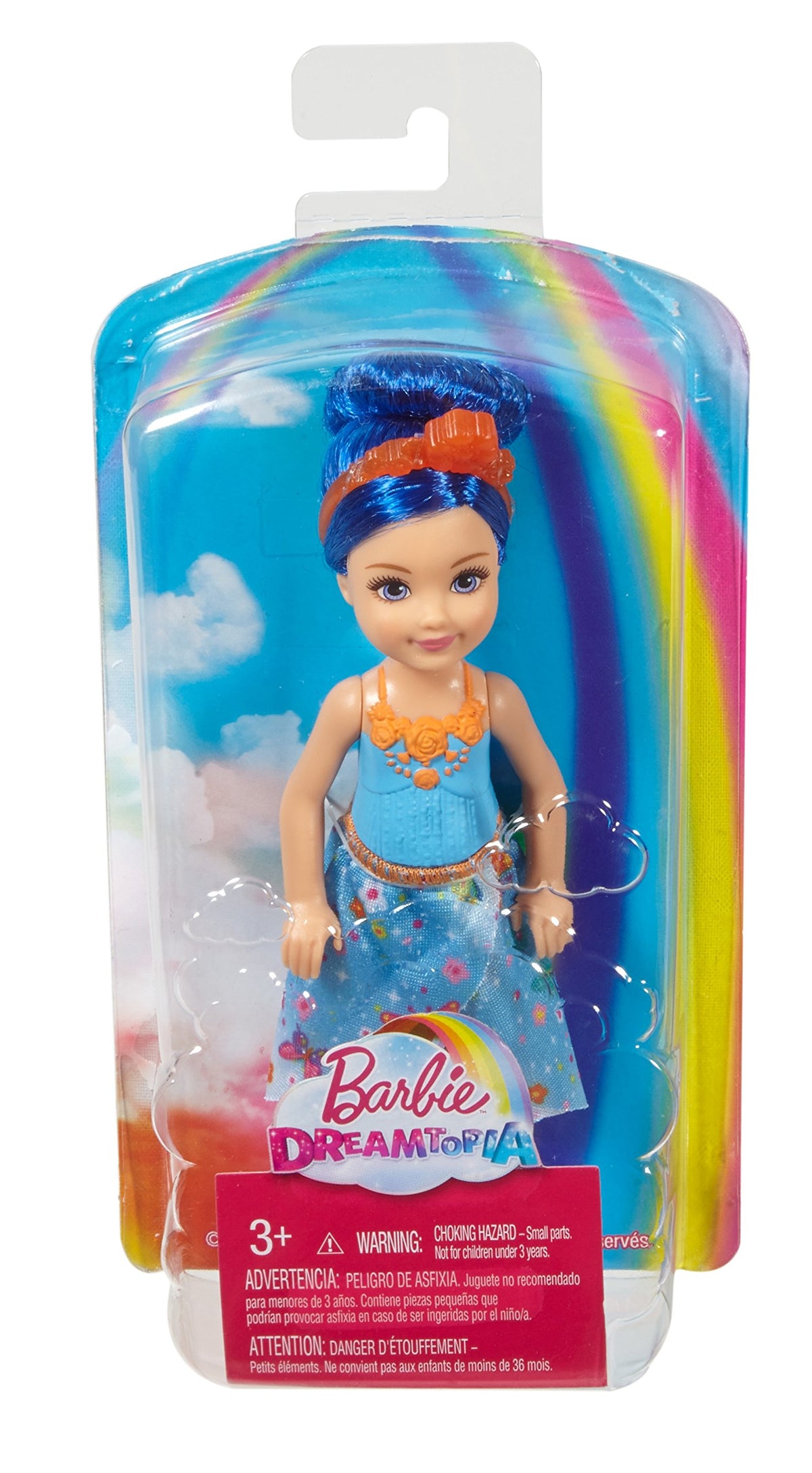 Seven colorful princesses bring the colors of the rainbow to life just as in Barbie Dreamtopias Rainbow Cove. This adorable rainbow princess doll celebrates the color blue with vibrant blue hair and a bright outfit! Her blue bodice is decorated with golden flowers, and the print skirt has a wrap silhouette. Cute blue shoes and an orange tiara hairpiece complete the rainbow look. Young dreamers will love exploring new worlds and dreamy stories with the colorful rainbow princess dolls. Collect all of the Barbie Dreamtopia dolls and accessories and let your dreams come to life (each sold separately, subject to availability). Includes blue Rainbow Cove sprite doll wearing skirt, shoes and headpiece. Colors and decorations may vary.