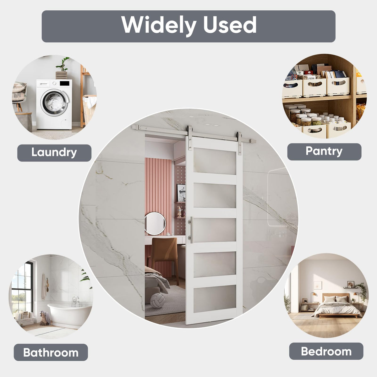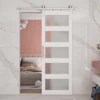 Barnsmith 28In X 84In Glass Barn Door With 5Ft Brushed Nickle Sliding Door Hardware Included & Handle,5-Panel Frosted Glass Solid Wood Water-Proof Pvc Surface,Pre-Drilled Easy Assembly,White