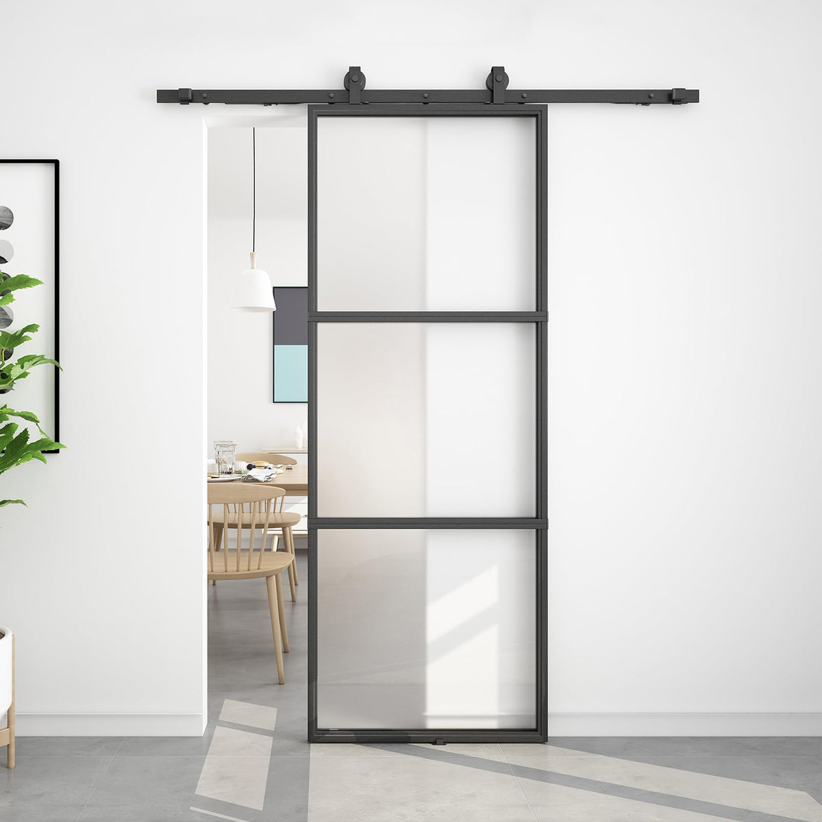 Contemporary Design Ensures Privacy:This glass barn door combines a black metal frame panel with tempered frosted glass to ensure your whole family’s privacy.It offers functional and elegant charm to your space and it could be installed in your bathroom,kitchen,living room,bedroom and so on. | Solid Construction:This door is made of high quality powder coated metal frame and tempered frosted glass.Dimension:32' W x 84' H x 1-3/5' D,assemble required.Compared with other doors,this door is packed in a carton and passed package drop test.All doors have passed 10,000 opening and closing tests,very sturdy and durable,fits for your everyday use. | Package Included:1x door panel;1x5.5ft hardware set includes 2x3ft rails,2xroller hangers,2xanti-jump blocks,1xright stopper,1xleft stopper,2hex keys,5x wall spacers,2xsoft close mechanism,2x internal floor mounted guides. | Step-by-step Installation Instruction:This door is divided into 3 pieces and needs to be assembled,we provide a detailed professional installation manual,you can also watch online installation video,it’s easy for you to install. | Perfect After-sales Service: We have a professional customer service team 24 hours online to serve you, If you encounter any questions or troubles, please let us know. We will be happy to solve them in time.