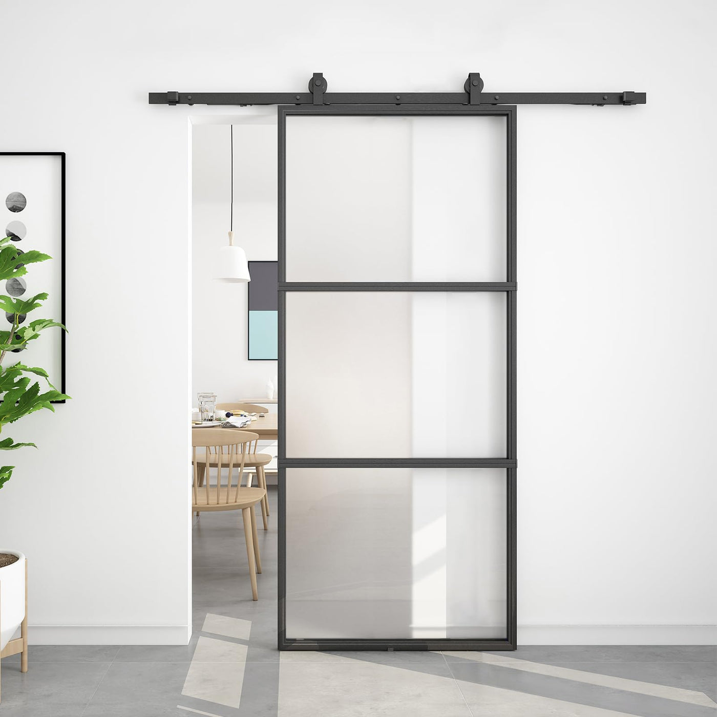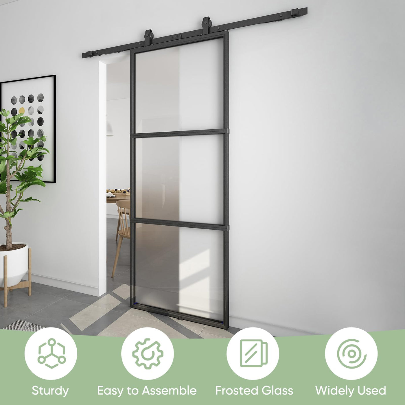 Contemporary Design Ensures Privacy:This glass barn door combines a black metal frame panel with tempered frosted glass to ensure your whole family’s privacy.It offers functional and elegant charm to your space and it could be installed in your bathroom,kitchen,living room,bedroom and so on. | Solid Construction:This door is made of high quality powder coated metal frame and tempered frosted glass.Dimension:36' W x 80' H x 1-3/5' D,assemble required.Compared with other doors,this door is packed in a carton and passed package drop test.All doors have passed 10,000 opening and closing tests,very sturdy and durable,fits for your everyday use. | Package Included:1x door panel;1x6ft hardware set includes 2x3ft rails,2xroller hangers,2xanti-jump blocks,1xright stopper,1xleft stopper,2hex keys,5x wall spacers,2xsoft close mechanism,2x internal floor mounted guides. | Step-by-step Installation Instruction:This door is divided into 3 pieces and needs to be assembled,we provide a detailed professional installation manual,you can also watch online installation video,it’s easy for you to install. | Perfect After-sales Service: We have a professional customer service team 24 hours online to serve you, If you encounter any questions or troubles, please let us know. We will be happy to solve them in time.
