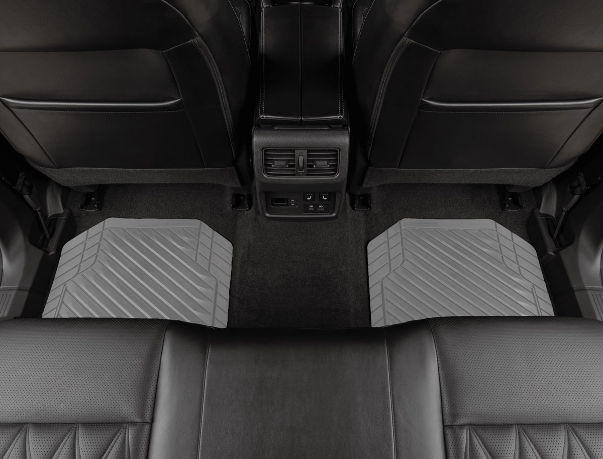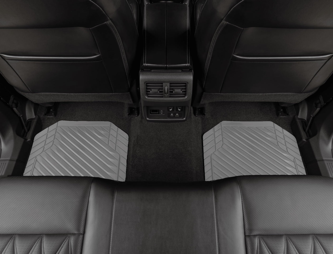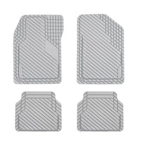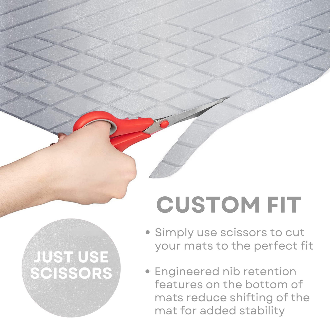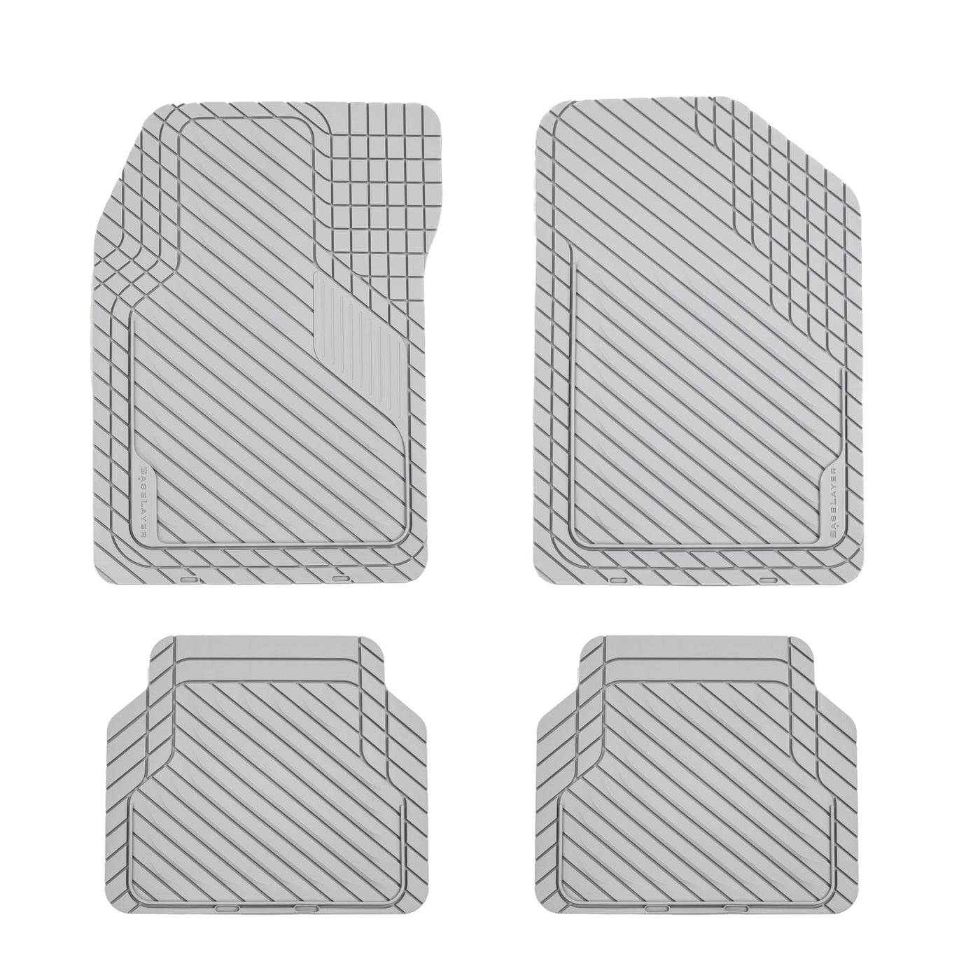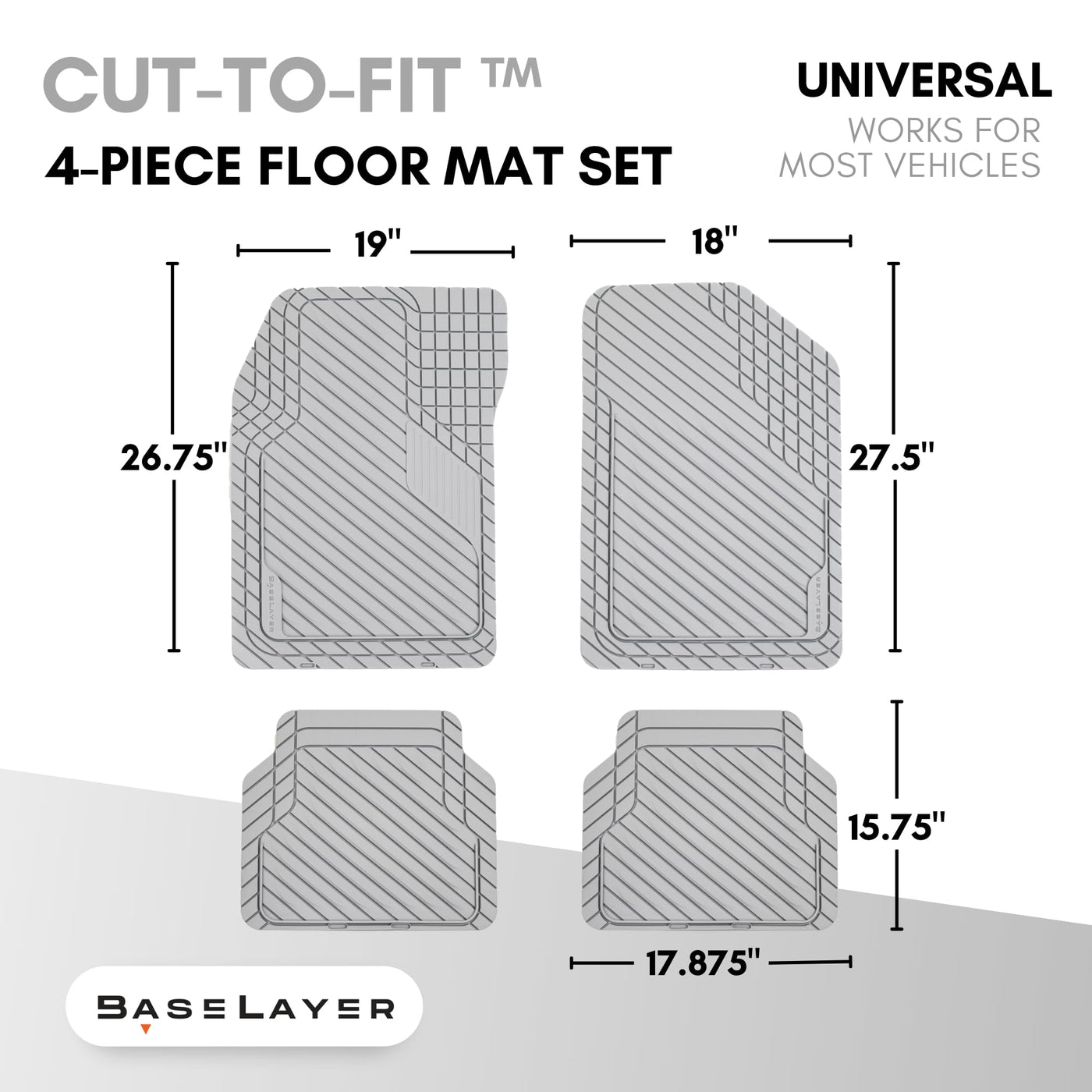 BASELAYER Cut-to-Fit Light Gray 4-Piece floor mats set are designed and manufactured in the USA. Our 4-piece Light Gray car mat accessories include front driver, front passenger, rear left, and right mats that are designed to protect your vehicle's interior. Functionally stylized features channel dirt, mud, and water into reservoirs away from your carpet, shoes, and clothing. Engineered to protect all the high traffic areas of the floor, your mats can be custom trimmed to your liking to fit most vehicle configurations on the front, back, and sides. Front Driver 19 wide x 26.75 long. Can be cut to 15 wide x 23.75 long. Front Passenger 18 wide x 27.5 long. Can be cut to 15 wide x 25.5 long. Rear Mats 17.875 wide x 15.75 long. Can be cut to 15.25 wide x 12.5 long. Compatible with Acura, Buick, Chevrolet, Chrysler, Dodge, Ford, Honda, Hyundai, Kia, Mazda, Mitsubishi, Nissan, Subaru, Toyota, Rav 4, Lexus, Volkswagen and other vehicles.