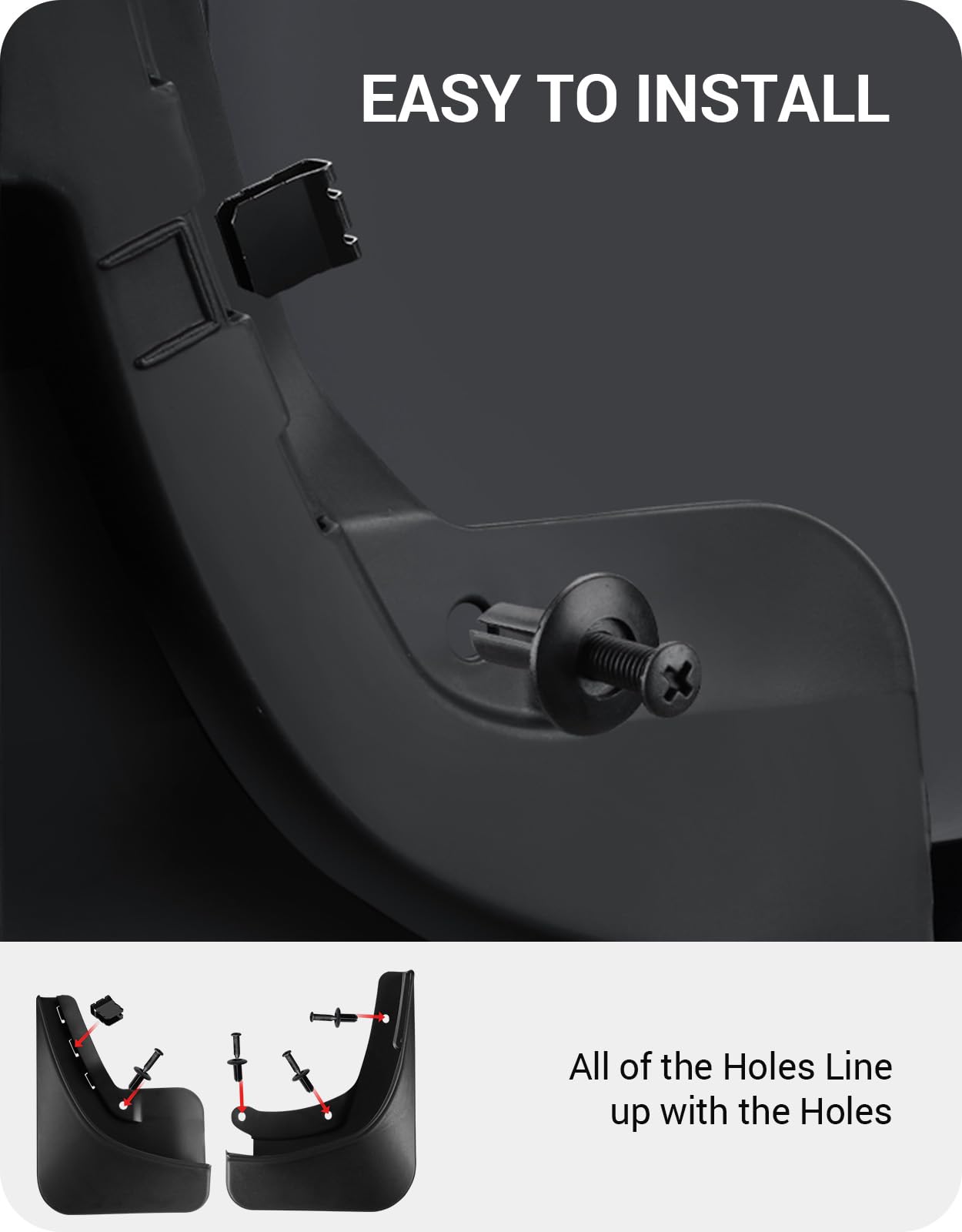 Q: How easy is it to install the BASENOR mud flaps?A: Installation of the BASENOR mud flaps is straightforward and does not require drilling or tape. They utilize original hole locations for a seamless installation, allowing you to install them quickly with basic tools.