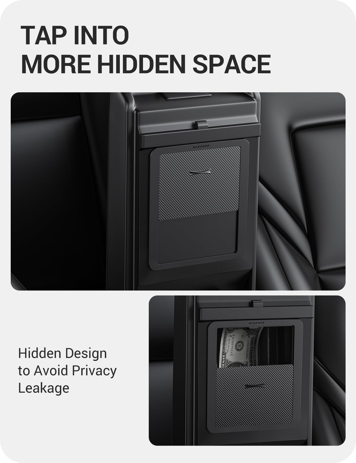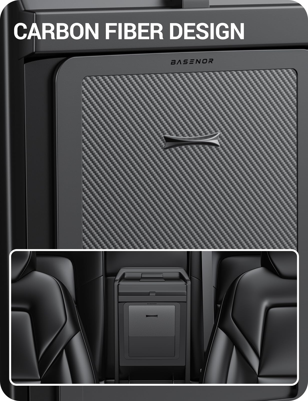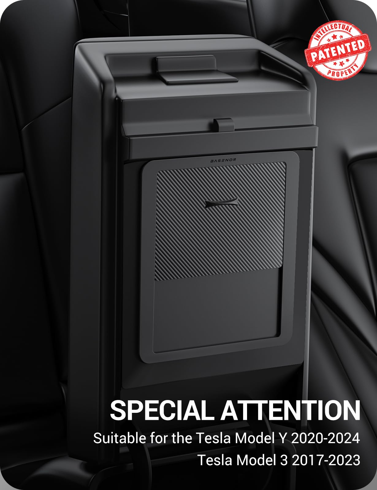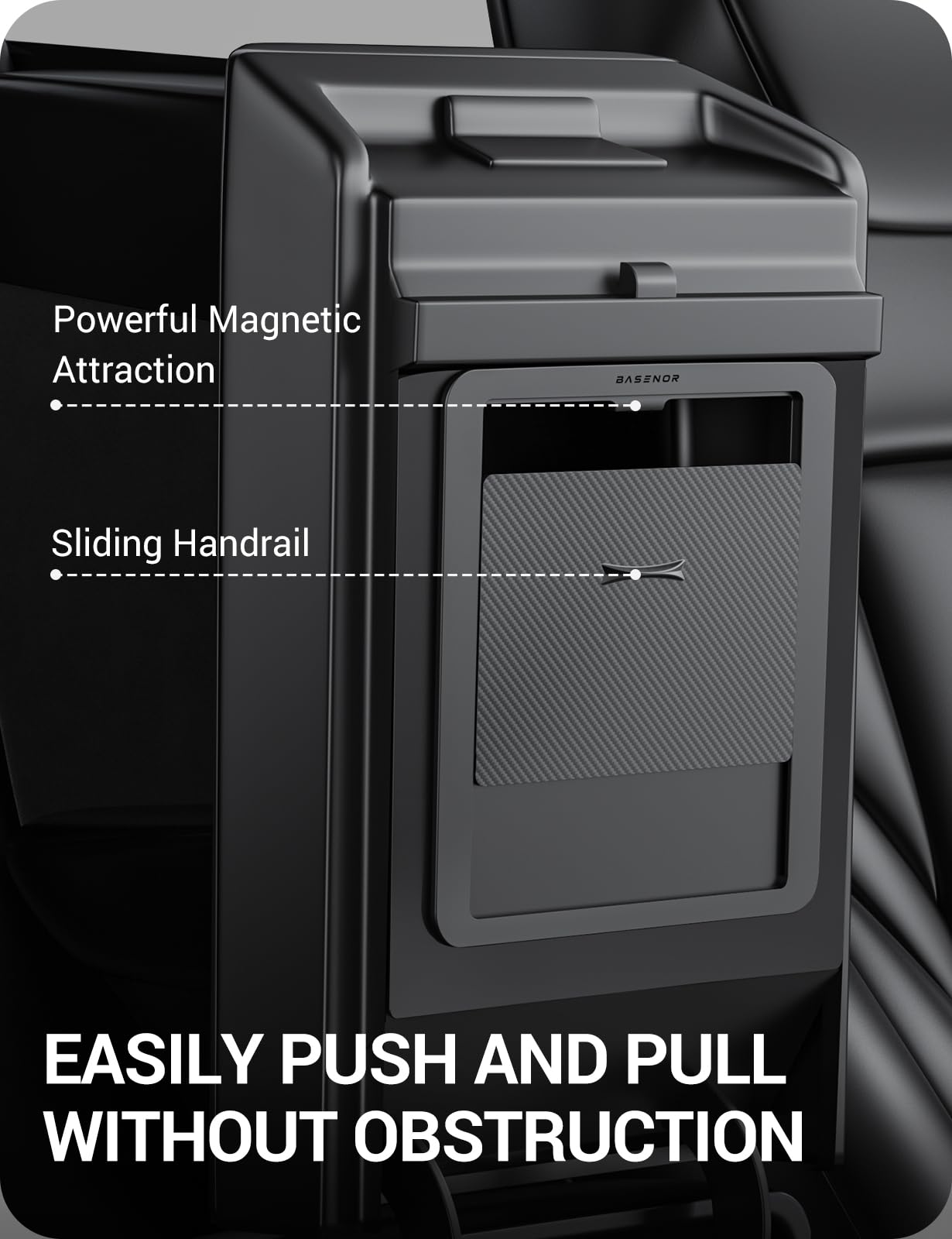 BASENOR Upgraded Tesla Model Y Model 3 Armrest Hidden Storage Box [Carbon Edition] [Powerful Magnetic] Center Console Secret Com