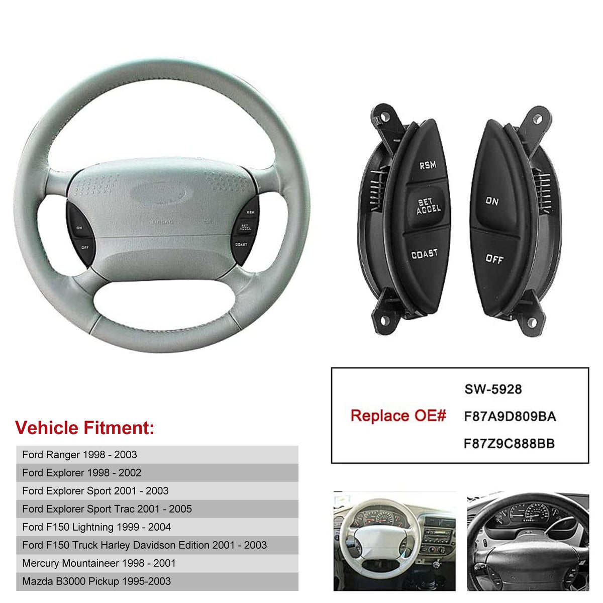 BASIKER Black Steering Wheel Cruise Control Switch Button For 1998-2005 Ford Explorer Series & Ford Ranger Mercury Mazda Perfect Replacement Vehicle Fitment: OEM Part Number : F87A-9D809-BA F87Z9C888BB SW5928 F87A9D809BA sw6349 sw5919 Fit For FORD 1998 1999 2000 2001 2002 Ford Explorer 2001 2002 2003 Ford Explorer Sport 2001 2002 2003 2004 2005 Ford Explorer Sport Trac 2001 2002 2003 Ford F150 Truck Harley Davidson Edition 1999 2000 2001 2002 2003 2004 Ford F150 Lightning 1998 1999 2000 2001 2002 2003 Ford Ranger Fit For MERCURY 1998 1999 2000 2001 Mercury Mountaineer Fit For MAZDA 1995 1996 1997 1998 1999 2000 2001 2002 2003 Mazda B3000 Pickup Vehicle Fitment Summary To confirm that this part fits your vehicle, enter your vehicle's Year, Make, Model, Trim and Engine in the Compatibility Table. Do not including harness , wire and terminals Package Included: A Pair Steering Wheel Cruise Control Switch Button (without wire harness)