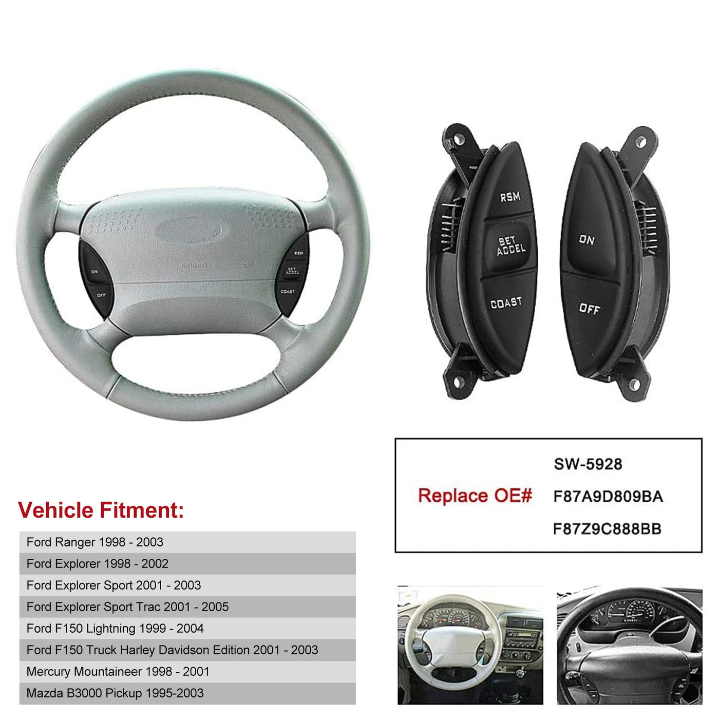 Oem Part Number : F87A-9D809-Ba F87Z9C888Bb Sw5928 F87A9D809Ba Sw6349 Sw5919 Fit For Ford 1998 1999 2000 2001 2002 Ford Explorer 2001 2002 2003 Ford Explorer Sport 2001 2002 2003 2004 2005 Ford Explorer Sport Trac 2001 2002 2003 Ford F150 Truck Harley Davidson Edition 1999 2000 2001 2002 2003 2004 Ford F150 Lightning 1998 1999 2000 2001 2002 2003 Ford Ranger Fit For Mercury 1998 1999 2000 2001 Mercury Mountaineer Fit For Mazda 1995 1996 1997 1998 1999 2000 2001 2002 2003 Mazda B3000 Pickup Vehicle Fitment Summary To Confirm That This Part Fits Your Vehicle, Enter Your Vehicle'S Year, Make, Model, Trim And Engine In The Compatibility Table. Do Not Including Harness , Wire And Terminals Package Included: A Pair Steering Wheel Cruise Control Switch Button (Without Wire Harness)