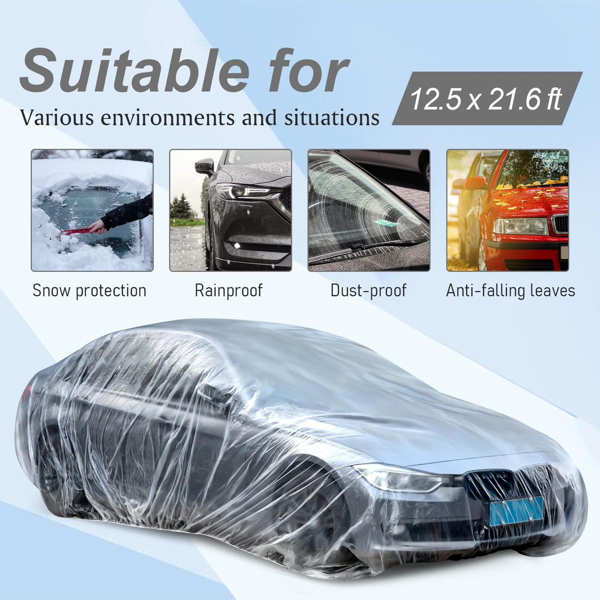 Features: Quality material: The plastic car cover is made of thickened high-pressure PE material, the surface is soft and smooth, durable and not easy to break. It can be used once or repeatedly. Easy installation: You only need to put the car protective cover on your car, and put the elastic band around the car cover to ensure that it is fixed, and then it can play a very good protective role. Diverse functions: These thickened transparent plastic car covers can effectively prevent dust, water, fog, rain, ice, snow, leaves, bird droppings and other external pollutants, and can also prevent some sharp objects from damaging the vehicle cause some damages. Specifications: Material: PE Product size: 12.5 x 21.6 ft Color: as picture shown The package includes: 2 x Plastic car covers Note: Manual measurement, please allow slight size error. Colors may vary slightly due to different screen displays.