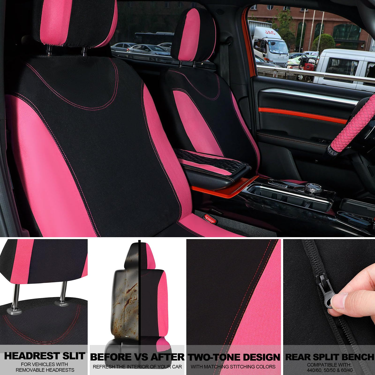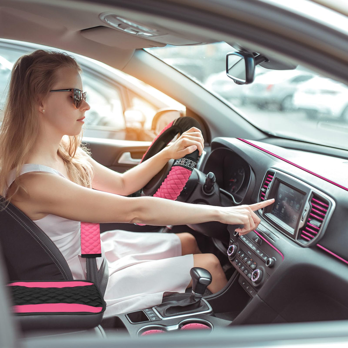 Features: Air conditioning vent trim strips: If you like to decorate the car interior, then these car air conditioning vent trim strips are something you can't miss. It makes your car interior look more colorful and active and shows your good taste. Suitable for Most Cars: The pink and black car accessories set are elastic, easy to install, you can stretch the seat cover to fit your seat and steering wheel better, they can fit big most car models. Specifications: Main material: Steering wheel cover: Leather, rhinestone Holders: silicone, rhinestone Color: pink and black Size: Steering wheel cover: fit about 37-38 cm/ 14.57-14.96 inches diameter steering wheel Safety belt covers: about 2.9 x 9 inches Button rhinestone stickers: about 1.5 inches Cup holders: about 2.75 inches Package includes: 1 x Steering wheel cover 2 x Cup holders 1 x Car armrest cover 2 x Shiny seat belt covers 2 x Bling starter button rings 2 x Front seat covers 1 x Set of split rear seat covers 5 x Individual headrest covers 20 x Car air-conditioning vent trim strips 1 x Interior molding trim 1 x Scraper 4 x Floor mats Notes: Manual measurement, please allow slight errors on size. The color may exist a slight difference due to different screen displays.