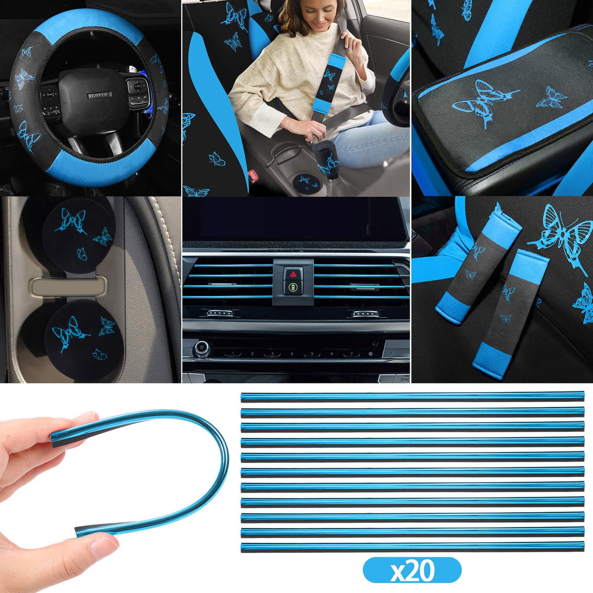 BBTO 43 Pcs Butterfly Car Seat Full Set Butterfly Car Accessories for Women 5 Front Rear Seat Covers Wrist Strap 2 Pcs Cup Mat A