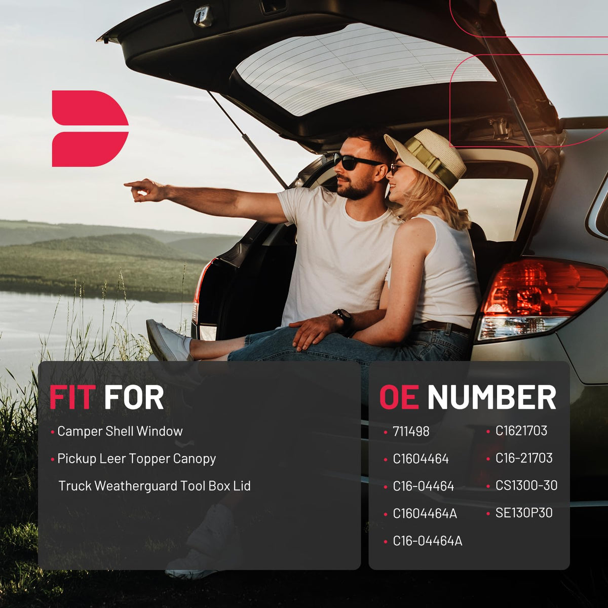 ?Basic Info?The lift supports are universal and used for Leer ARE SnugTop camper shell truck topper rear window, Truck Pickup Cab Canopy Door Camper Shell Topper RV or DIY box. It's 13 inches from side to side. Each strut can support 30 Lbs weight. Please don't compress it with your hand. It has a 12+6-month warranty for any quality problem and lifetime customer service. | ?How to Choose Right One? ?We recommend that measure weight and length before purchasing. It will be more convenient for your shopping experience. The lift support can be used for DIY, RV, or camper shell. Please check OE number: 711498, C1604464, C16-04464, C1604464A, C16-04464A, C1621703, C16-21703, CS1300-30, SE130P30. Please notice that 30Lbs/ 13 inches (don't furnished with ball studs.) | ?Worry about Easy-use? ?BDFHYK gas struts are very easy to install. You can install it only by yourself with a flat screwdriver. We prepared online instructions for your reference anytime and anywhere. It's also very convenient after installation and almost like your original one. It's very soft during use. | ?Worry about Quality? ? Every product needs to be tested many times before announce until we make sure there are no problems like noise, stiffness, and other common problems. We also offer 12+6 months warranty service for replacing a new one if you meet any quality problem during use. Please trust us and we will offer you a satisfactory experience. | ?About BDFHYK?a professional auto parts manufacturer with mature industry lines. We have our factory and professional developer. It's been more than 10 years that we serve different customers from different areas. We do our best to hear from customers and update our products. Choose BDFHYK, Choose good service.