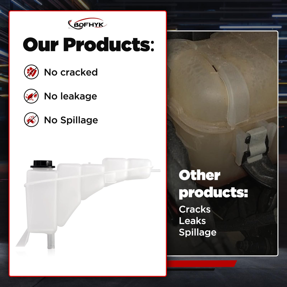 Q: Is the BDFHYK Engine Coolant Expansion Reservoir compatible with my Ford vehicle?A: Yes, the BDFHYK Engine Coolant Expansion Reservoir is compatible with various Ford vehicles, including the Ford Excursion (2000-2005) and Ford Super Duty F-250, F-350, F-450, and F-550 (1999-2004). It is important to verify compatibility based on your vehicle's year, model, and OE number.