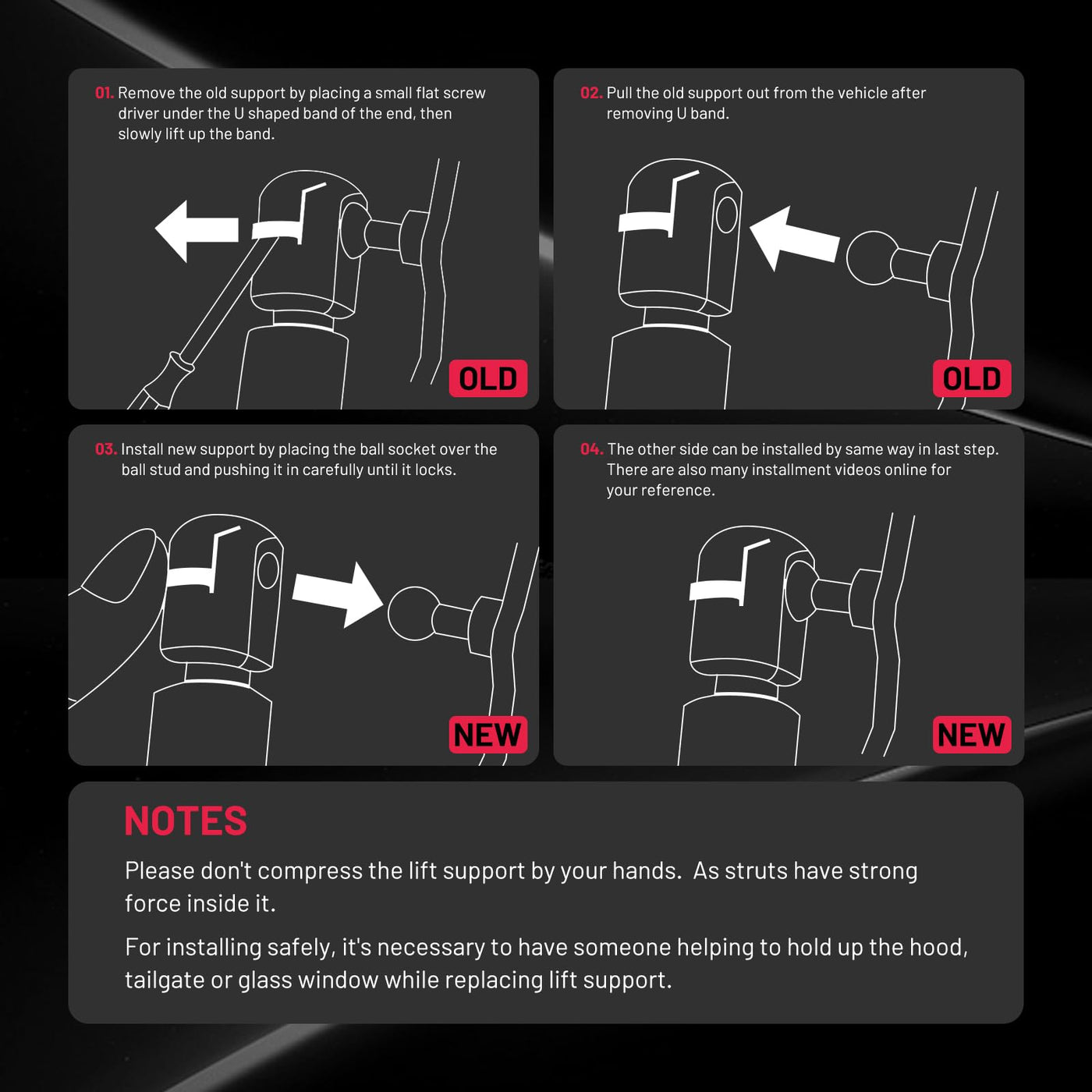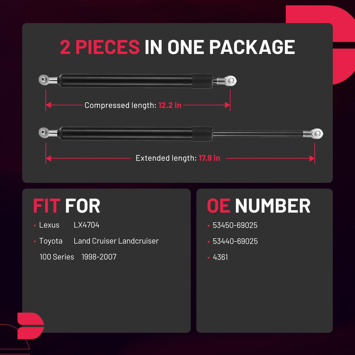 ?Hood Lift Support?BDFHYK lift supports are compatible with Toyota 1998-2007 Land cruiser all series, Compatible with Lexus LX470. It has 2 items in one set and installs at front hood. The support is Exactly fitting for OE products. | ?OE Number?BDFHYK front hood gas spring is exactly fit for OE: 53450-69025, 53440-69025, 4361. It can only be used on front hood. | ?Specifications?BDFHYK gas struts have 12.2in compressed and 17.91in extended. It's designed by OE model and exactly fitting for reference OE above. ?Ball studs are furnished with strut. | ?High Quality?BDFHYK lift struts have leak-proof piston seal and rust-resistant protection, which offers the item stronger endurance and longer lifetime in extreme conditions. | ?After Sales Service? BDFHYK Lift support have 12+6 months warranty service. If you meet any problem, please be free to contact us by ''ask seller''. Please don't compress lift support by hand as it's strong force inside.