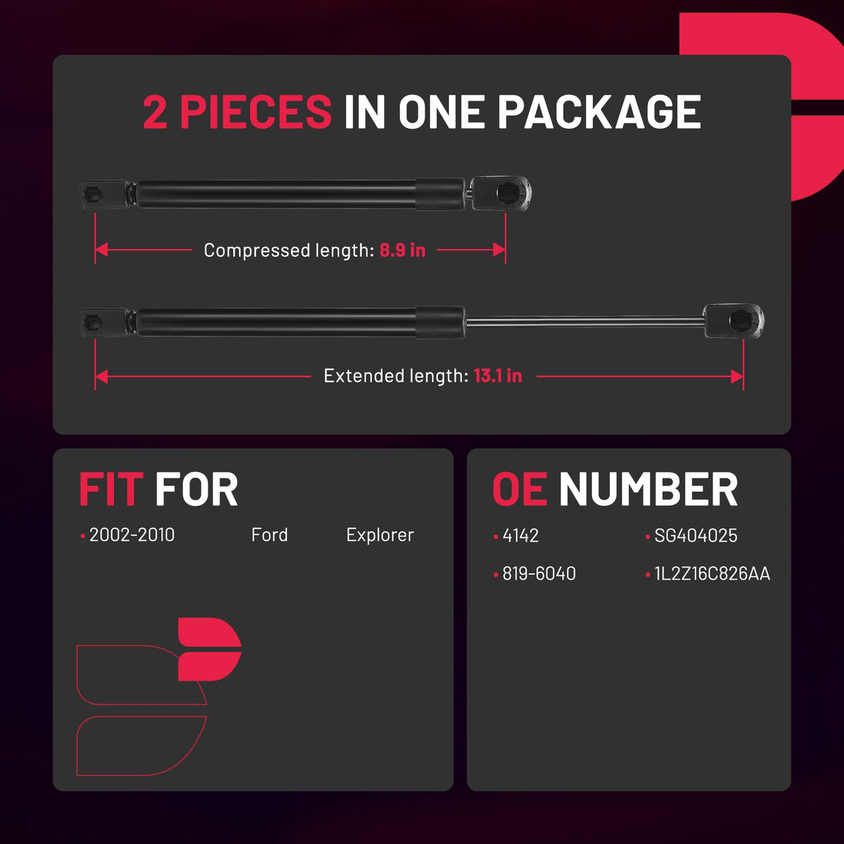 ???Compatible with Explorer? BDFHYK lift supports is compatible with 2002-2010 Explorer. It has 2 items in one set and installs at front hood. The support is Exactly fitting for OE products. | ???OE Number?BDFHYK front hood struts is exactly fit for OE: 4142, SG404025 WGS-123, 8196040, 13956, 6083RK, 7921SI. It's onlt used at front hood. | ???Specifications?BDFHYK lift supports is 8.9in compressed and 13.1in extended. It's designed by OE model and exactly fitting for reference OE above. ?Ball studs aren't furnished with strut. | ???High Quality?BDFHYK lift supports strut has leak-proof piston seal and rust-resistant protection, which offers the item stronger endurance and longer lifetime in extreme conditions. | ???After Sales Service?BDFHYK lift supports has 12+6 months warranty service. If you meet any problem, please be free to contact us by ''ask seller''. Please don't compress lift support by hand as it's strong force inside.