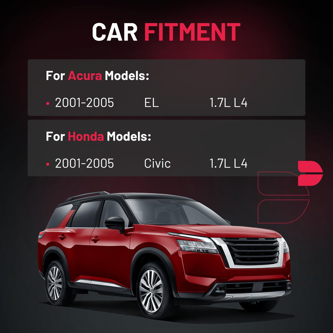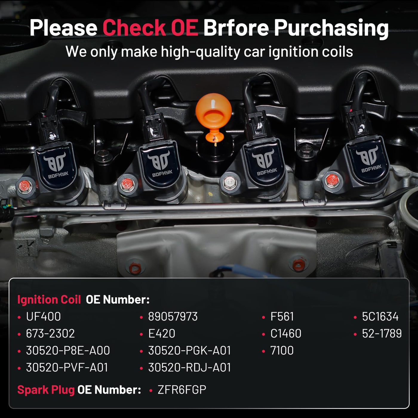 Q: What vehicles are compatible with the BDFHYK Ignition Coil Pack and Iridium Spark Plugs?A: The BDFHYK Ignition Coil Pack and Iridium Spark Plugs are compatible with the 2001-2005 Acura EL and the 2001-2005 Honda Civic 1.7L L4 models. It is important to verify the OE part numbers UF400 and ZFR6FGP for proper compatibility.