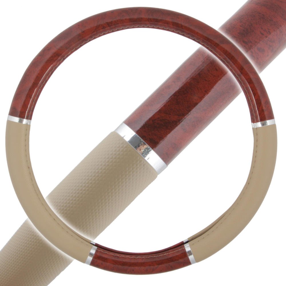 Bdk Dark Wood Grain Car Steering Wheel Cover, Standard 15 Inch With Beige Faux Leather Grip, Made To Fit Most Auto Truck Van Suv