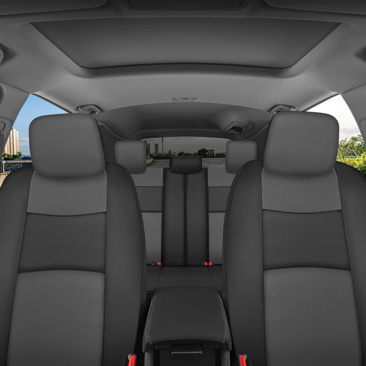 BDK Front Seat & Back Seat Car Seat Covers 2-Tone Matching Full Set for Cars, SUVs, Trucks, & Minivans:Introducing our Universal Fit 2-Tone Car Seat Covers, the perfect blend of style, comfort, and protection for your vehicle. Designed to fit most cars, SUVs, trucks, and minivans, includes front and back matching auto seat covers, offering full coverage for your cars interior. Whether you're upgrading the look of your vehicle or providing an extra layer of protection for your seats, these automotive seat covers are the ideal choice.The stitched accents enhance your vehicle's interior, giving it a fresh, stylish look. The two-tone color scheme complements any car interior, adding a pop of color while maintaining a sophisticated appearance. Whether you prefer a classic, neutral tone or a bold contrast, these car seat covers elevate your vehicles aesthetic without compromising on functionality.The covers fit snugly on most seats, providing a secure and customized fit. While they offer a universal fit, some slight adjustments may be needed to achieve the perfect look for your specific vehicle.These seat covers are made from high-quality, durable faux leather material that offers excellent protection for your seats. They shield against spills, stains, dirt, and wear and tear, keeping your car's interior looking fresh and new.A few examples of car or truck make and models these car seat covers will fit include: Ford (Explorer, Ranger, Escape, Expedition, Fusion, Lightning Mustang), Toyota (Tacoma, Rav4, Highlander, Prius, Tundra, Camry, Corolla), Chevrolet, Chevy Traverse, Dodge, Honda (Civic, Accord, CRV, Pilot, Odyssey, HR-V), Nissan, Jeep, Tesla, Kia, Audi, Subaru, Hyundai, BMW, Mercedes, Lexus and more!