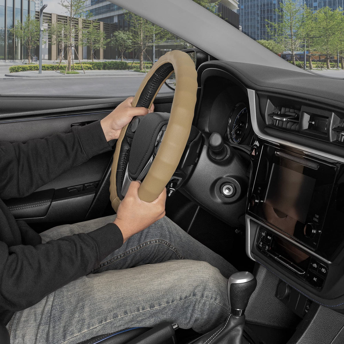 Q: What size steering wheels does the BDK Genuine Beige Leather Steering Wheel Cover fit?A: The BDK Genuine Beige Leather Steering Wheel Cover is designed to fit most standard steering wheels with a diameter of 13.5 to 14 inches, ensuring a snug and secure fit.