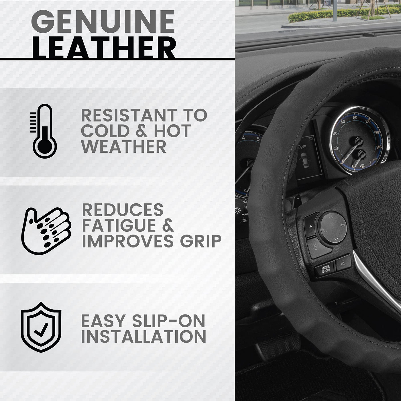 Bdk Genuine Black Leather Steering Wheel Cover For Car, Medium (145 - 155) - Ergonomic Comfort Grip For Men & Women, Universal Fit Car Steering Wheel Cover For Most Vehicles