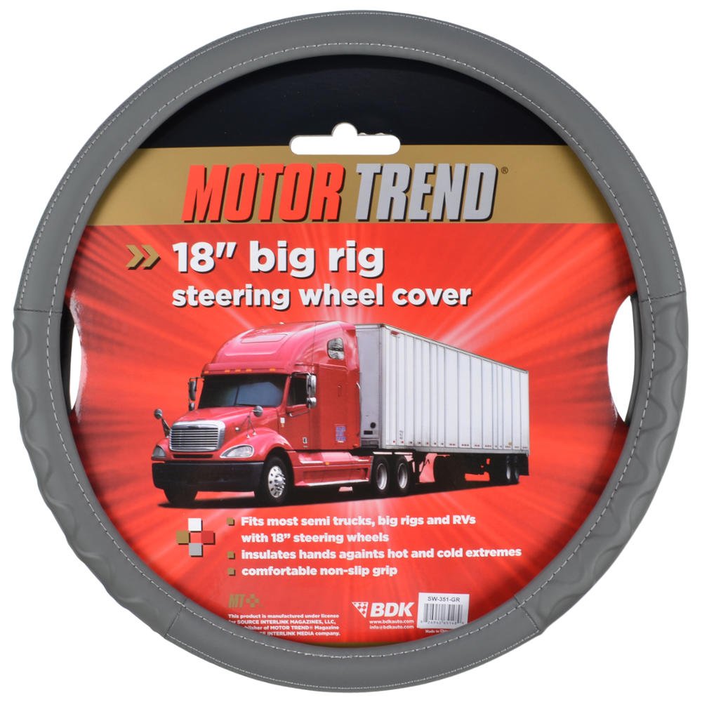 Q: What size steering wheels does the Motor Trend Ergonomic Leather Grip Steering Wheel Cover fit?A: The Motor Trend Ergonomic Leather Grip Steering Wheel Cover is designed to fit large steering wheels with an 18-inch diameter, making it perfect for big rigs, semi trucks, and other large vehicles.