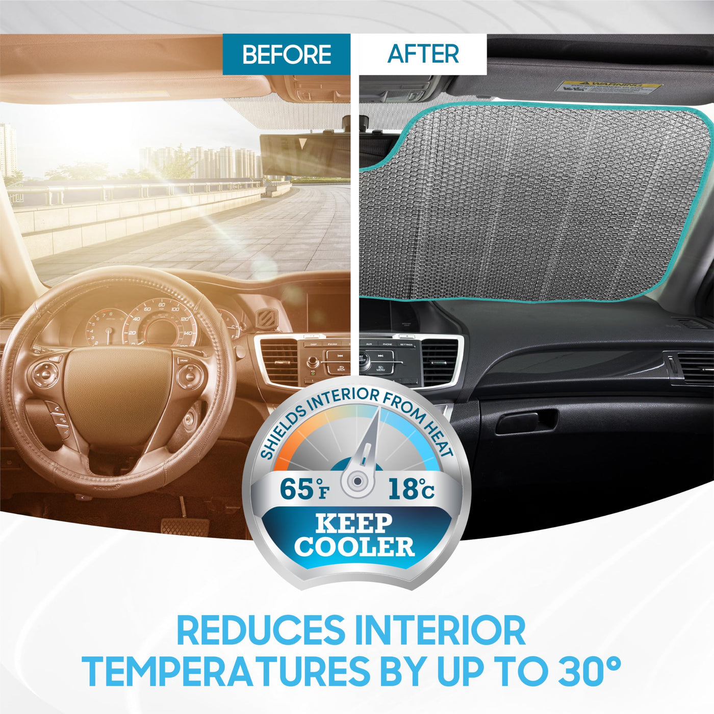 Top Quality Fitment: Size 58'' Width X 27'' Height. This Windshield Cover Sun Shade Universally Fits The Front Window On Most Cars, Trucks, Suvs, And Minivans. By Using The Rear-View Mirror As Support, The Window Sun Shade Is Extremely Easy To Set Up And The Accordion Folding Design Makes It Easy To Store In The Glove-Box. | Comfortable Cool Interior: Stay Cool On Sunny Days With Our High-Quality Windshield Sunshade For Car Dash Protector. It Reduces Your Car
