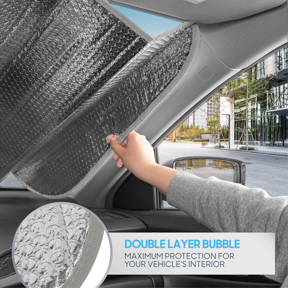 Q: How does the sun visor help in reducing car interior temperature?A: This sun visor is constructed with a dual-layer bubble that blocks harmful UV rays and significantly reduces interior car temperatures by 30-50 degrees, keeping your vehicle cooler on sunny days.
