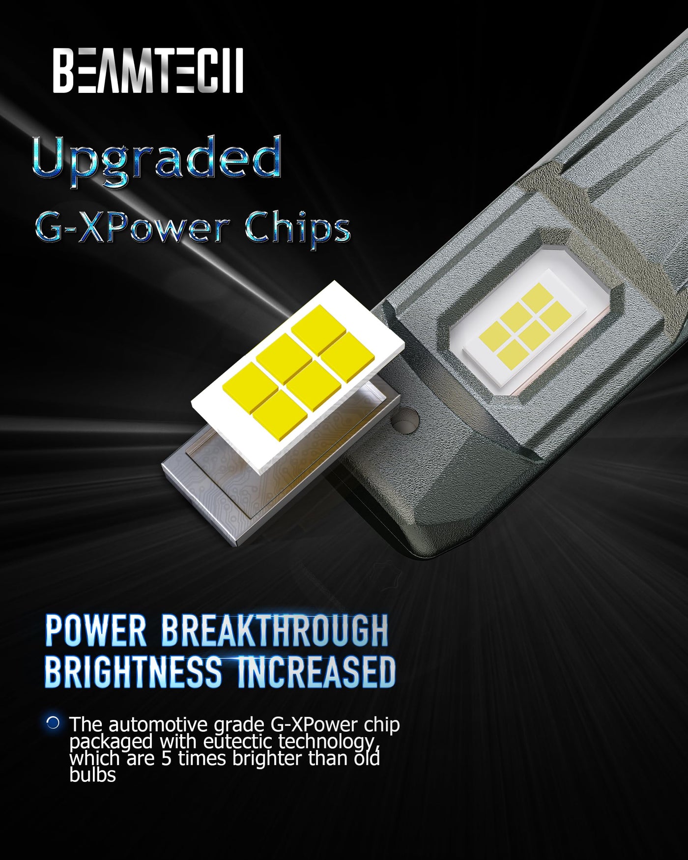 Q: What makes BEAMTECH 9005 Fog Light Bulbs brighter than standard bulbs?A: BEAMTECH 9005 Fog Light Bulbs utilize automotive grade G-XPower chips packaged with eutectic technology, providing a brightness upgrade that makes them 5 times brighter than traditional bulbs.