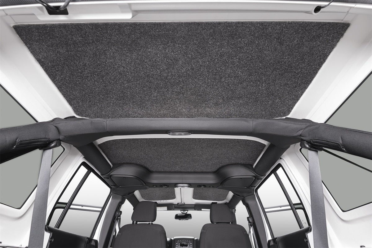 This 100% waterproof, fully custom die cut headliner kit installs quickly without the need to remove your hard top. The individual pieces can be quickly installed by removing the specially designed tape and pressing firmly into place. The BedRug material resists all harsh chemicals, and will not stain, stink, mold or mildew. The 1/2-inch polypropylene foam will help insulates your interior from road noise and heat. .