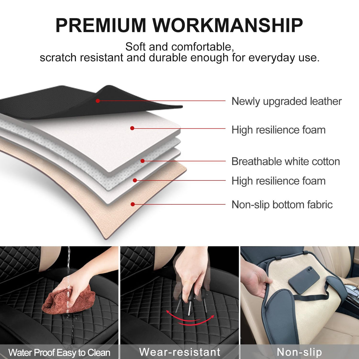 Q: What is the material of these seat covers?A: The seat covers are made from high-quality faux leather (PU leather), providing a stylish look while ensuring durability, comfort, and protection against wear and tear.