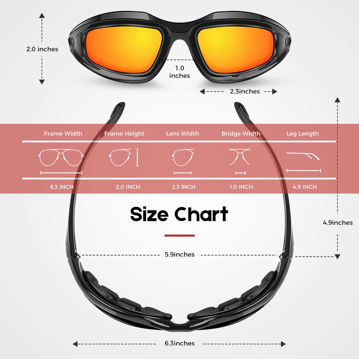 Q: What are the dimensions of the BELINOUS motorcycle glasses?A: The BELINOUS motorcycle glasses measure six point seven inches in length, five point seven inches in width, and two point two inches in height. These dimensions ensure a snug fit while providing ample coverage.