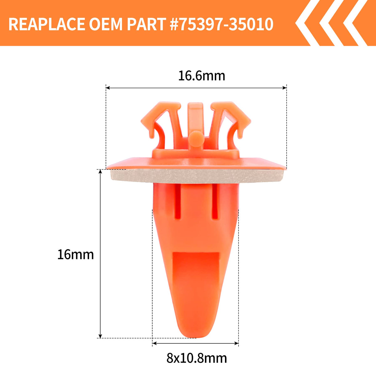 Q: What are the specifications of the clips included in this kit?A: The kit includes 30 fender flare clips: 15 blue nylon clips with a head diameter of 17mm and a stem length of 10mm (replaces Toyota part # 75495-35010), and 15 orange nylon clips with a head diameter of 17mm and a stem length of 17mm (replaces Toyota part # 75397-35010).