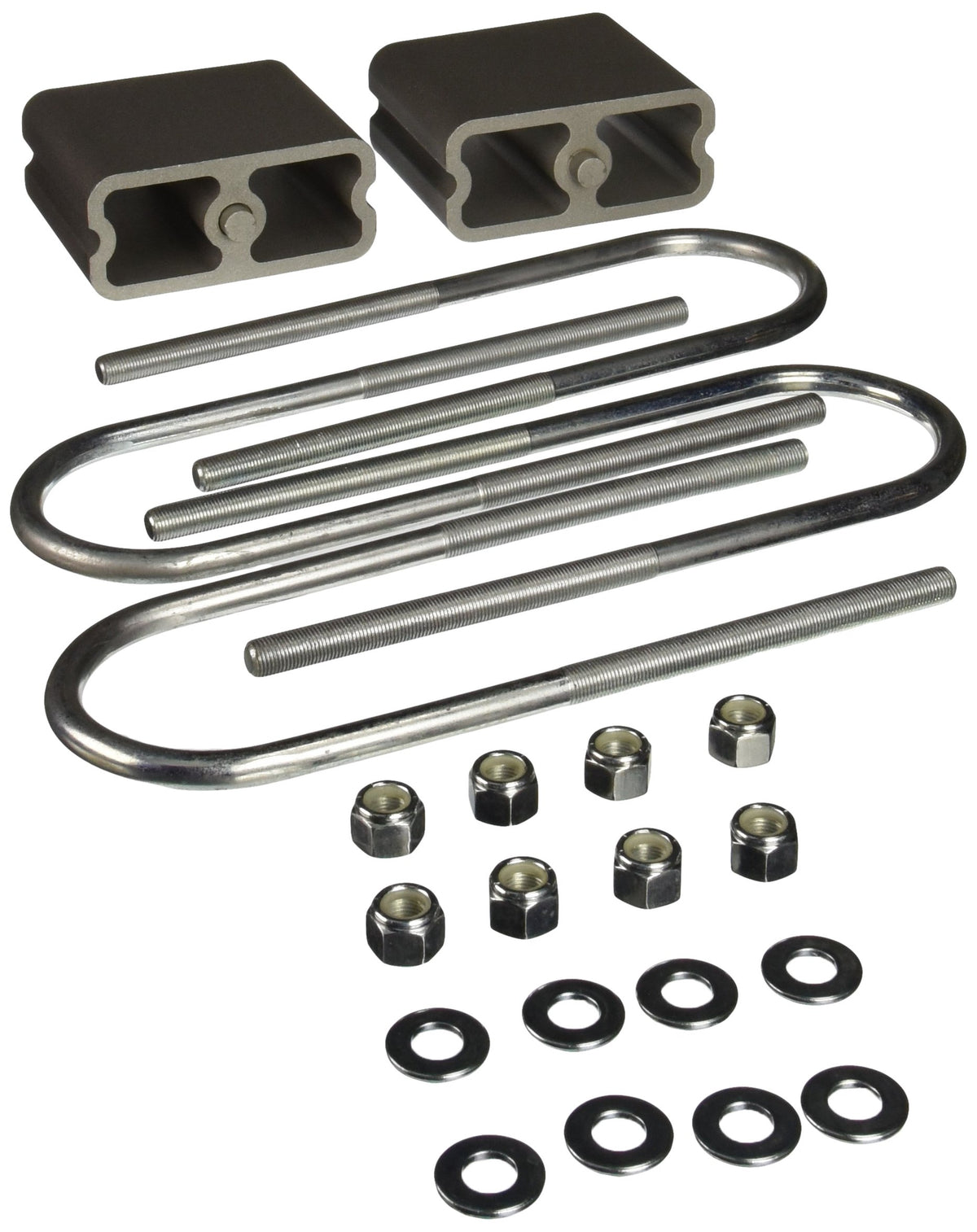 Q: What components are included in the Belltech 6203 Lowering Block Kit?A: The kit comes complete with lowering blocks, U-bolts, Nyloc nuts, and washers, ensuring you have everything needed for installation.