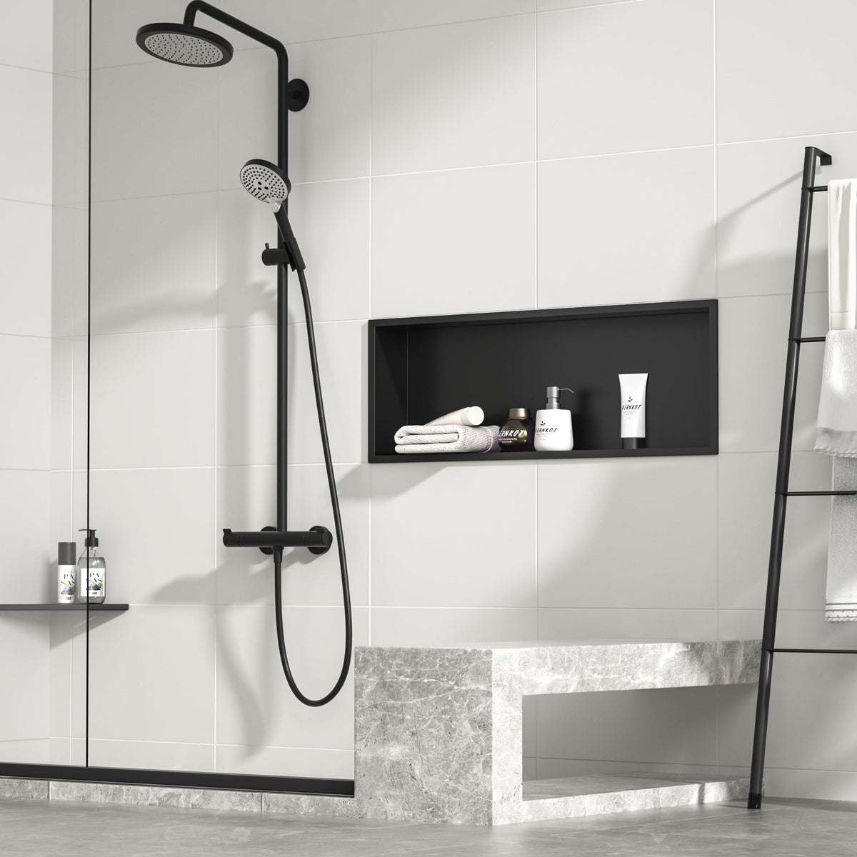 Q: What material is the shower niche made of?A: The shower niche is constructed from US ASTM standard 304 stainless steel, ensuring durability and resistance to corrosion, scratches, and rust.