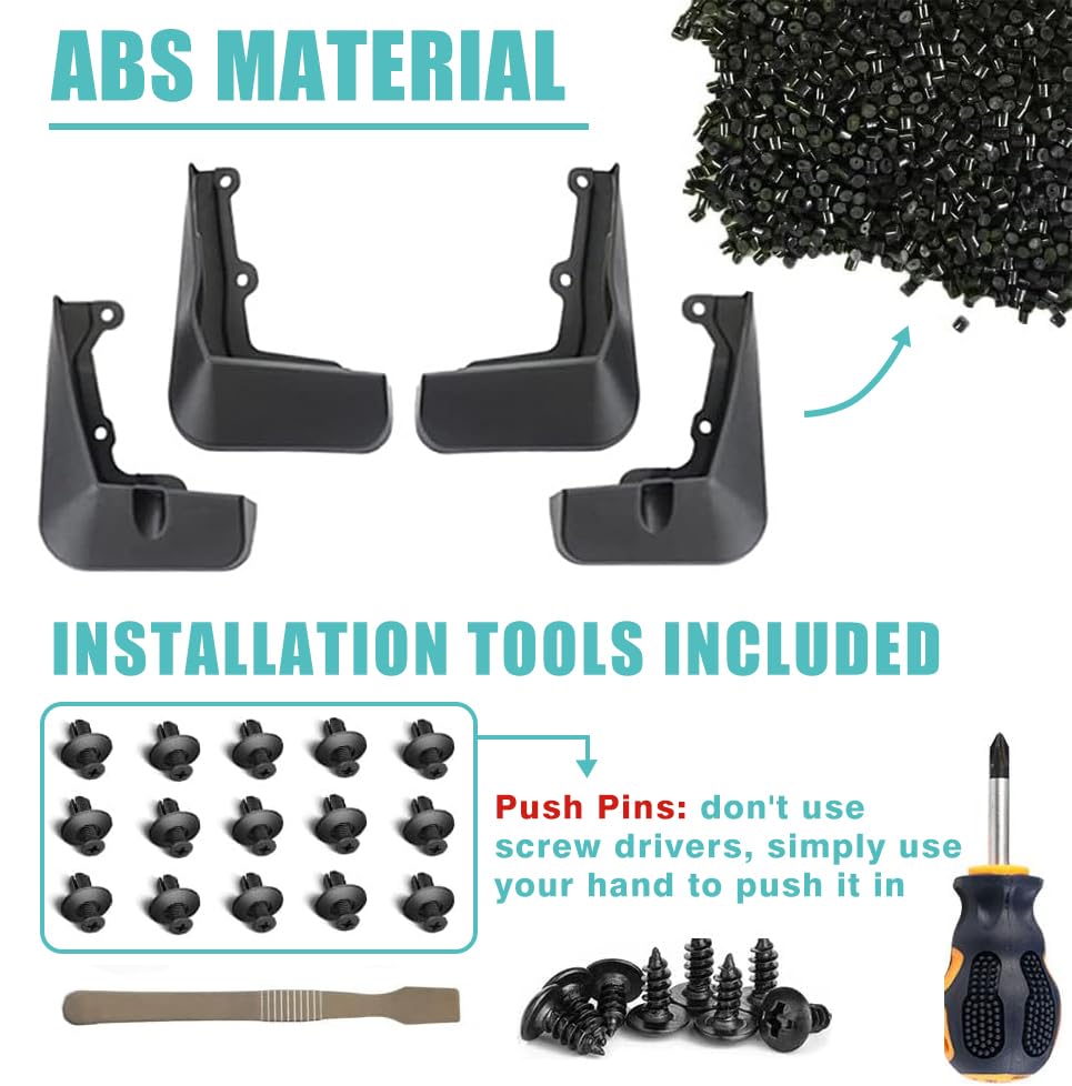 Q: How do I install the mud flaps?A: Installation is easy and does not require drilling. Simply follow the included installation guide. The package comes with all necessary tools and instructions for a straightforward setup.