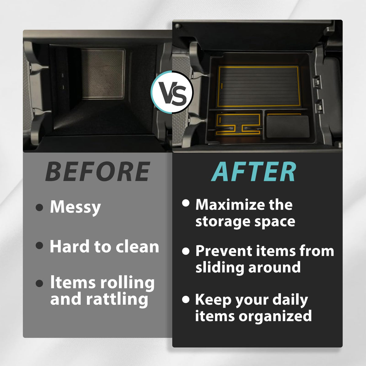 BestEvMod Upgraded V3 Armrest Storage Box and Cup Holder Lower Center Console Organizer Tray with PVC Trim Removable Coin Holder Compatible with Rivian R1T/R1S 2022-2024 (V3 Console+Lower Tray Yellow)