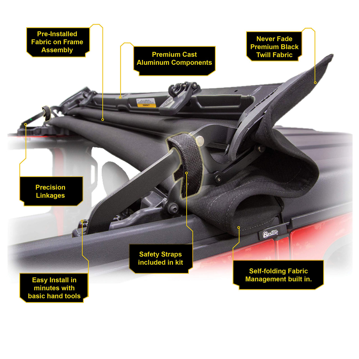 Q: What tools will I need for installation?A: The Bestop Sunrider comes with all necessary mounting hardware and illustrated instructions, typically requiring only basic hand tools for installation.