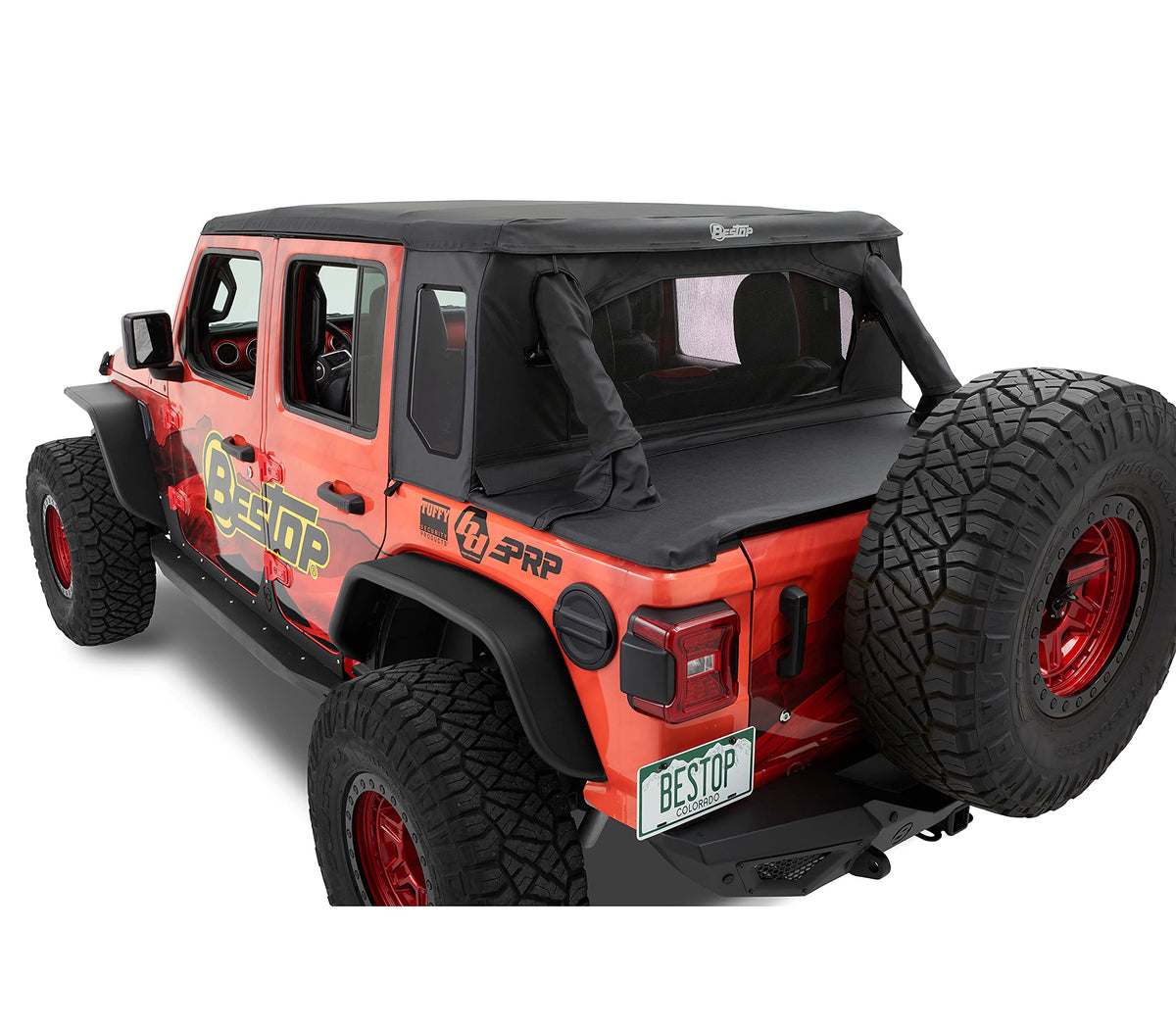 Q: What is included in the Bestop Halftop Kit for the 2018-2021 Wrangler JL 4-Door?A: The Bestop Halftop Kit includes three modular components that can be used together or separately, along with a zippered rear window for enhanced airflow.