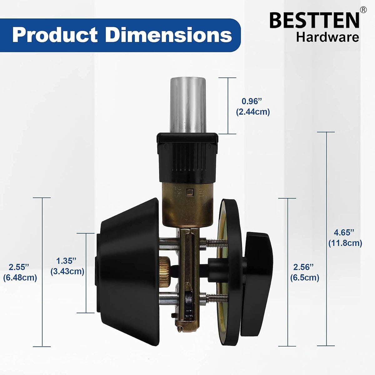 Q: What are the dimensions and compatibility of this deadbolt lock?A: The BESTTEN deadbolt is designed to fit right and left swing doors with adjustable backsets of 2-3/8” to 2-3/4” (60-70mm) and is compatible with door thicknesses ranging from 1-3/8” to 1-3/4” (35-45mm).