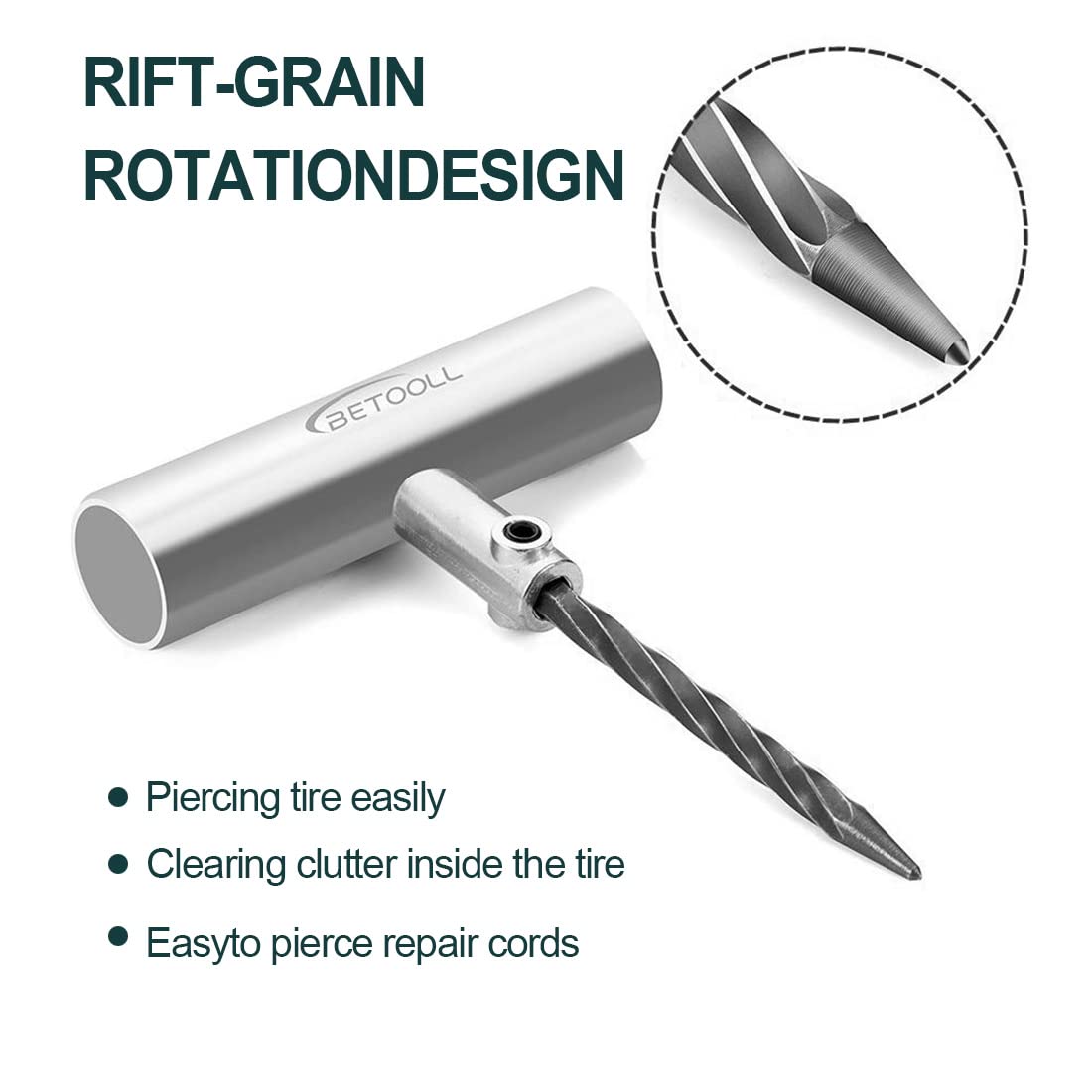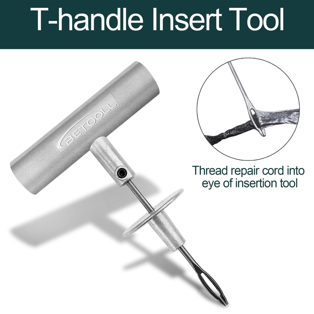 Q: What makes the T-handle tools in this kit effective for tire repairs?A: The T-handle tools in the BETOOLL Tire Repair Kit are made from heavy steel, providing enhanced steering power to insert repair plugs easily. This design allows for effective repairs on tubeless tire perforations, making it convenient to use anytime and anywhere.