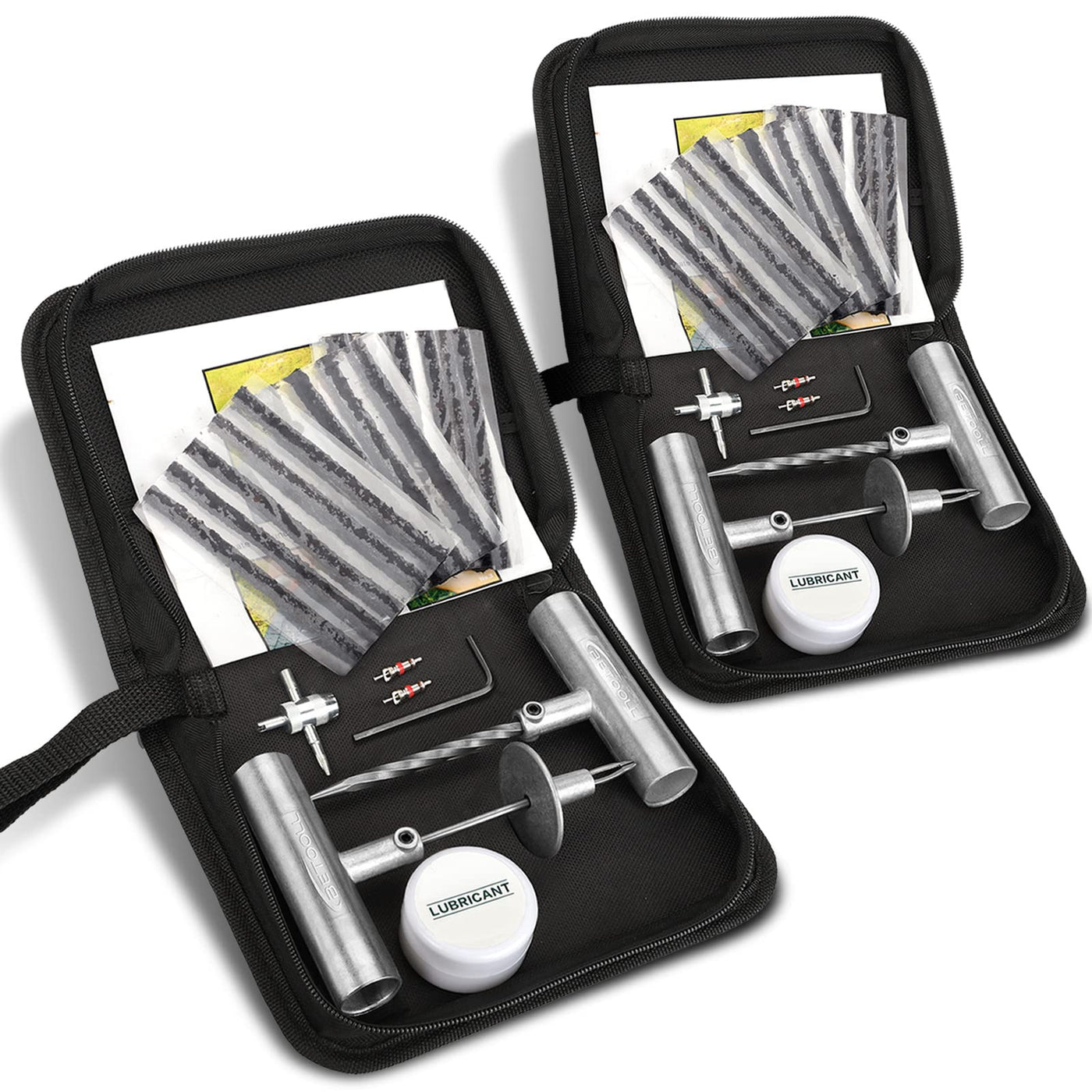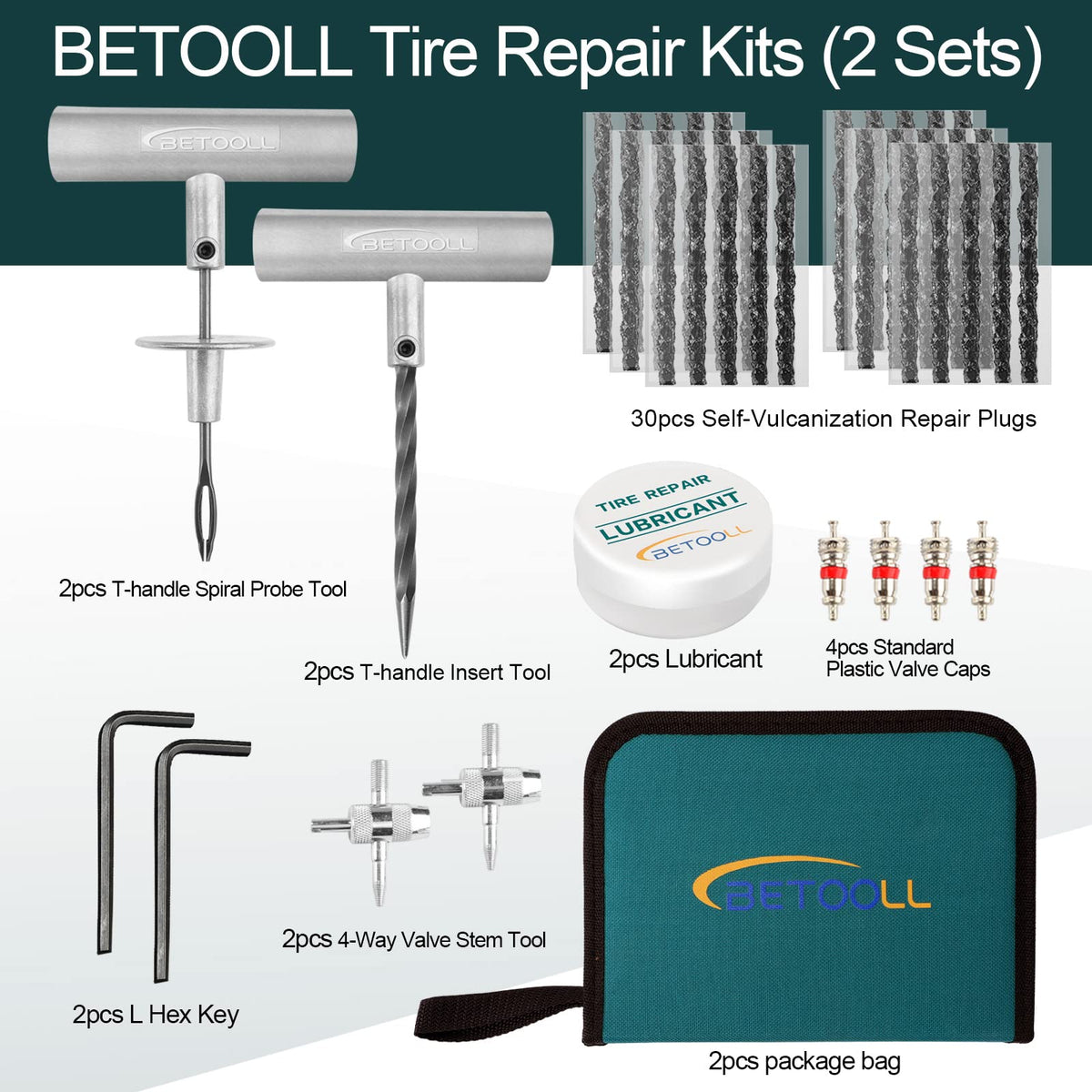 Q: How many pieces are included in the BETOOLL Tire Repair Kit?A: This tire repair kit includes a total of 24 pieces across 2 sets. It features essential tools such as T-handle insert and spiral probe tools, a 4-way valve stem tool, plastic valve caps, self-vulcanization repair plugs, lubricant, instructions, an 'L' hex key, and a convenient package bag.